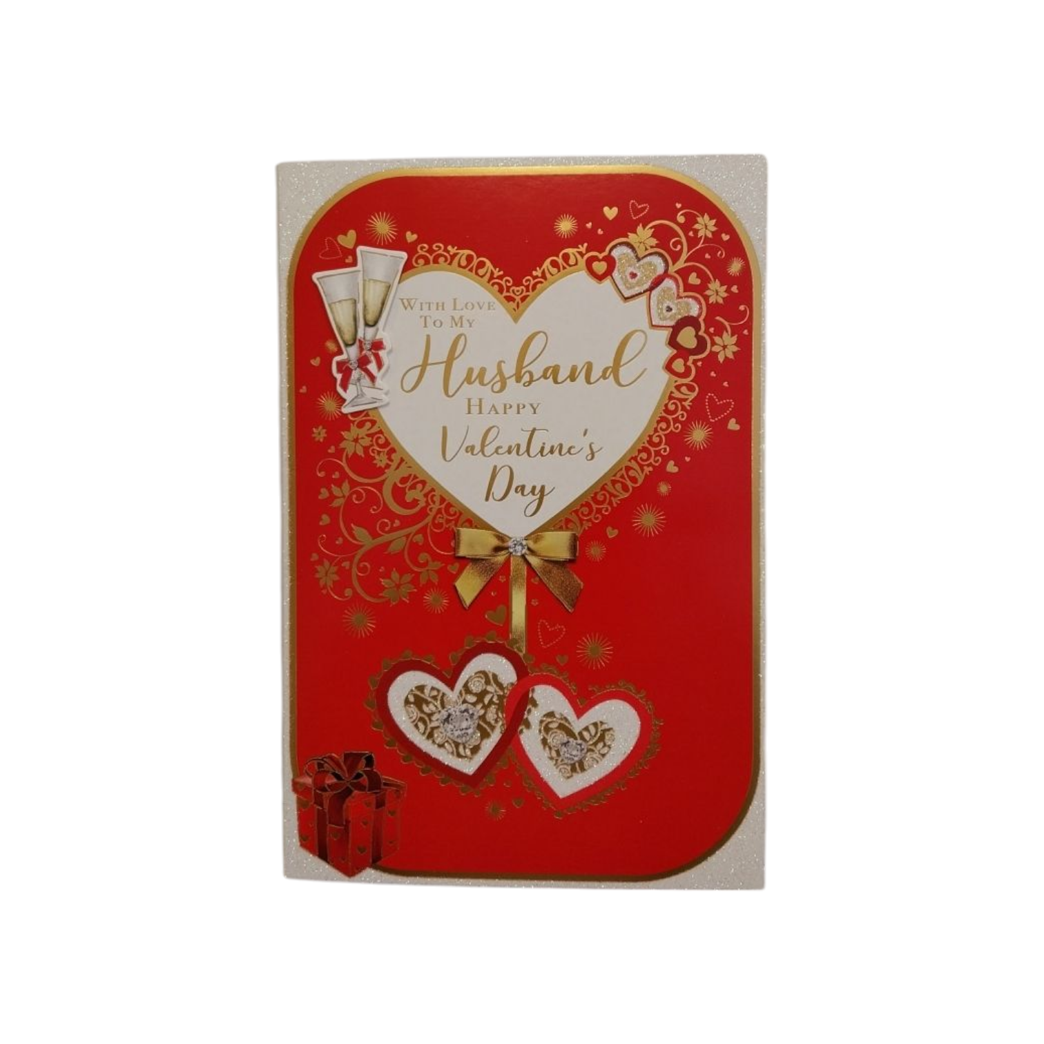 To My Husband Gold Foil Finished Red Valentine's Day Card. Delve into the season of love and make sure your husband feels treasured and loved, with this gorgeous Valentine's day card from Xpress Yourself. The perfect way to warm his heart. This textured card features gold foil details, embossed elements, ribbon and gems attached and comes with white envelope.