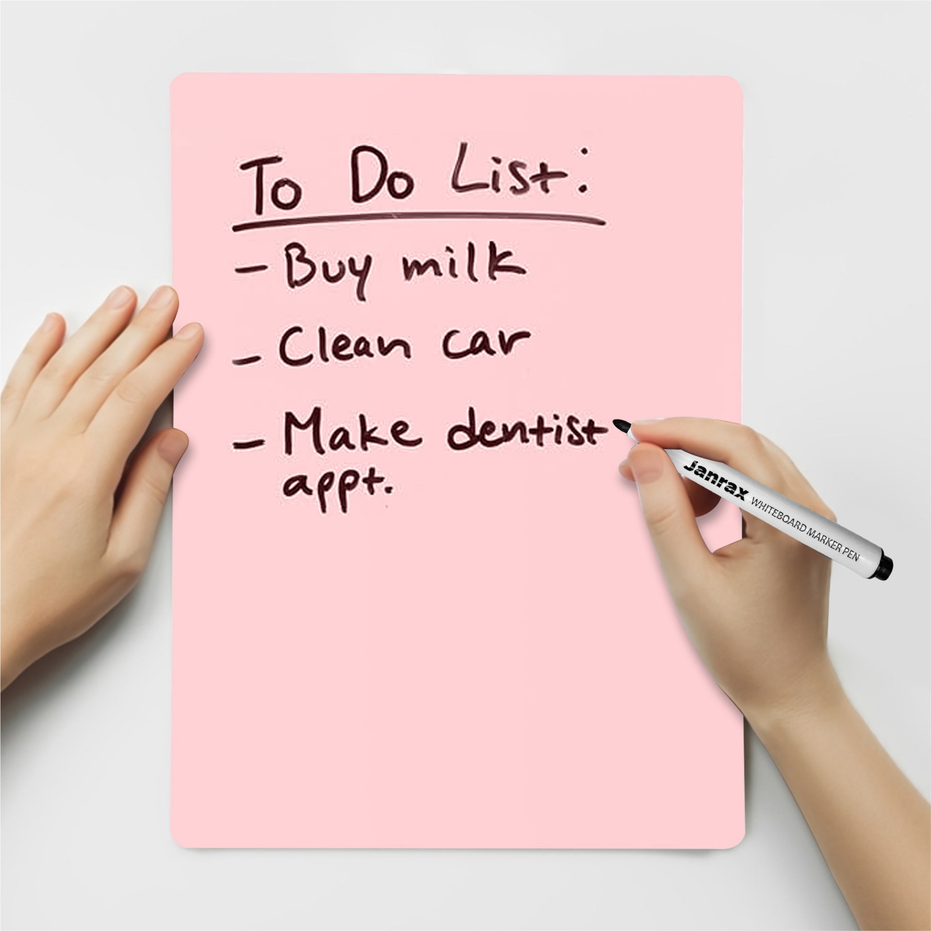 Assorted Coloured A3 Whiteboards: Colours included: Blue, Yellow, Green, Pink. Dry erase flexible whiteboards. Ideal for classrooms, schools, home learning and offices. Double sided whiteboard service. Designed to enhance clarity in communication for homes, offices, or classrooms. Each board, sized at 297 x 420mm, provides the perfect canvas for vibrant presentations, note taking or artistic sketches. Crafted with a top-notch, non-porous surface, writing becomes seamless and erasing is spotless, leaving no residue behind. Built for durability, these boards can stand the test of daily use, ensuring longevity. Coloured whiteboards can potentially be beneficial for individuals with dyslexia. Embrace an eco-friendly choice with these reusable whiteboards, minimising paper waste. Their streamlined design makes storage simple and efficient. Black Marker Pens with Dry Wipe Eraser: These Magnetic Whiteboard Black Marker Pens with Dry Wipe Eraser are the perfect solution for your whiteboard needs. These quality fine markers are designed to stick to a magnetic board. Along with the magnet the cap also has a dry wipe eraser for easy correction of mistakes. These are great for the home, office or classroom. Black Ink.