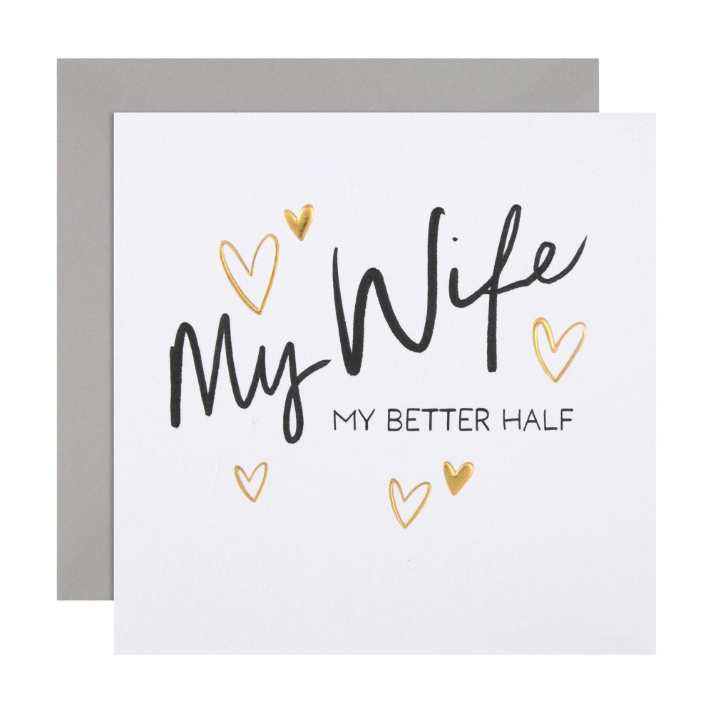 Celebrate your better half on her special day, with this gorgeous birthday card from our Inkwave collection. The perfect way to send her all the wishes and dreams she deserves. Printed on high-quality board, this textured card features a black and gold calligraphy text design with hearts design, embossed elements, metallic gold foil details, and the message, 'My wife, my better half' on the front. This card comes complete with a Hallmark branded, grey envelope. This card is fully recyclable, and made of material from well-managed, FSC®-certified forests and other controlled sources. Message Inside Reads: Happy birthday Card Measures: H16cm by W16cm. Within UK 'Letter' Postage Size Limits.