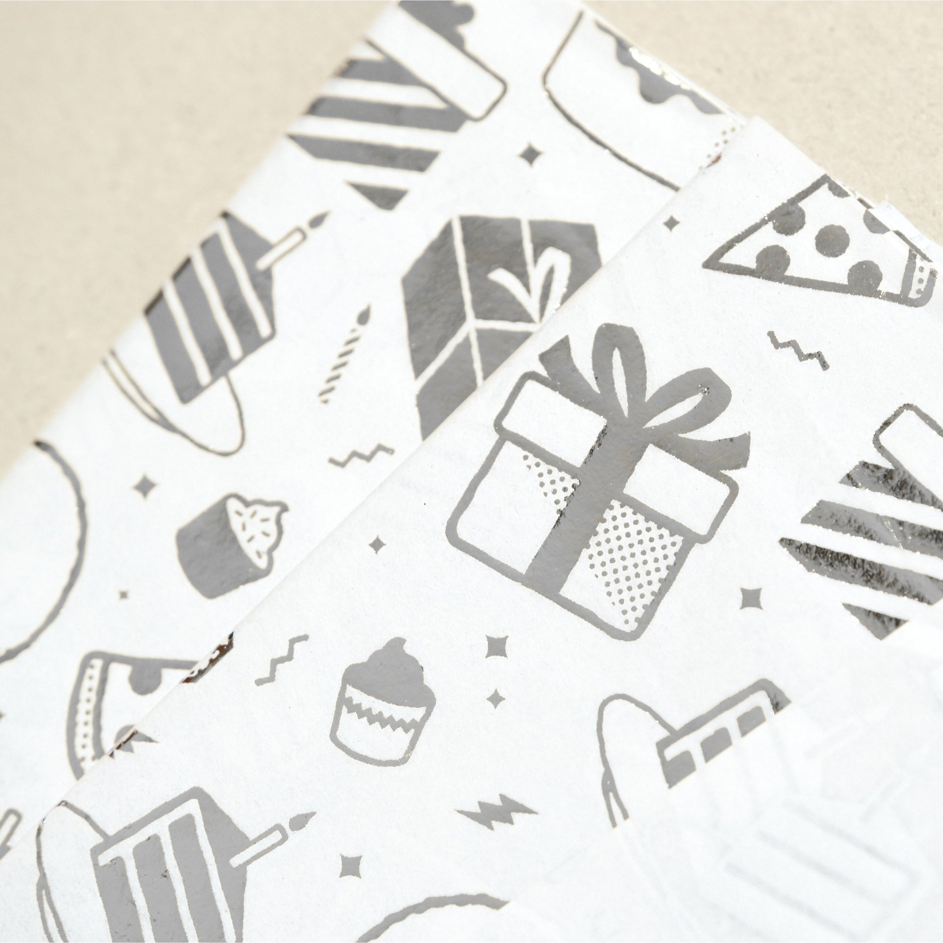 This birthday luxury silver metallic tissue paper is designed for stuffing, lining, and light wrapping. The pack includes 10 sheets of 18gsm plastic-free paper, each measuring 50x70cm. Suitable for decorative packaging and presentation use. The birthday-themed print makes it suitable for celebratory packaging.. Supplied as 20 Packs of 10.