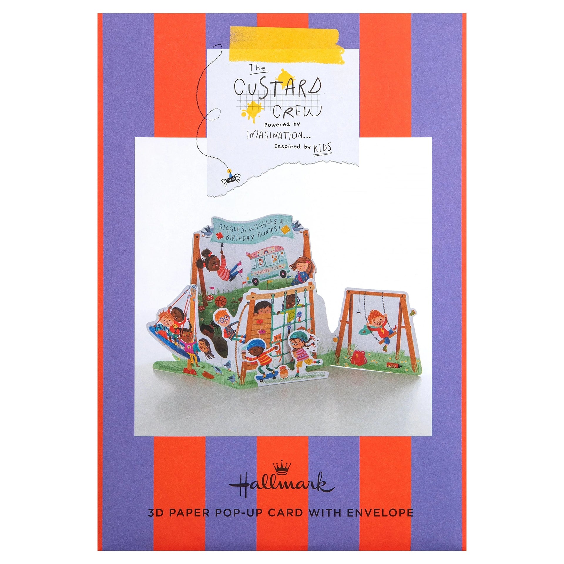 Have a day of chaos, fun and laughter, and make their day extra special, with this incredible 3D and pop-up Birthday card from Hallmark's The Custard Crew collection. The perfect keepsake for a Kids Birthday, and a unique memory they'll adore. Printed on high-quality board, this card pops up into a 3D diorama of a kids park, complete with swings, a zip tie and ice cream. This card features die-cut details, die-cut attachments and comes complete with a Hallmark branded, neon orange envelope. This card is fully recyclable, and made of material from well-managed, FSC®-certified forests and other controlled sources. Message On Front Reads: Giggles, Wiggles & Birthday Bumps! Message On Back Reads: Have the best day ever! Card Measures: H22.8cm by W15.9cm Constructed Card Measures: H22.8cm by W35cm by D9cm. Within UK 'Large Letter' Postage Size Limits. The Custard Crew Powered by Imagination... Inspired by Kids.