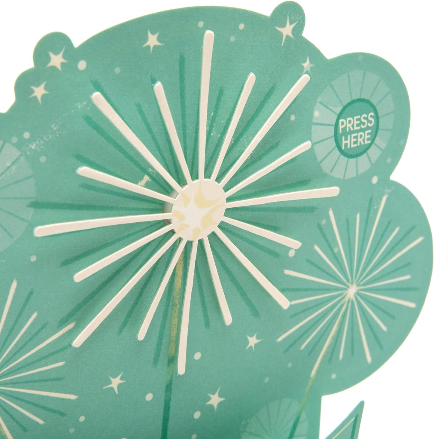 BIRTHDAY CARD: Celebrate their birthday with a bang with this amazing Hallmark 3D pop up birthday card! Transform their birthday into a cherished memory with a keepsake card. It’s not just a card, it’s a special moment that makes their day memorable. 3D BIRTHDAY DESIGN: This card pops up into a 3D diorama of a sparkler and confetti display. This card features the message 'Happy Birthday' on the front, a die-cut design, plays Happy Birthday music the centre spins for a truly unique experience. HIGH QUALITY CONSTRUCTION: This product is made using material from well-managed, FSC-certified forests and other controlled sources. WISHFUL MESSAGE: Write a special birthday wish they will love and accompany it with our birthday message, 'Here's to another year of shining'. The perfect way to add a personal touch and dazzle them with your love and joy. SIZE: This card measures 22.5 cm by 15.8 cm when flat and 22.5 cm by 15.8 cm by 10 cm when constructed. Accompanied by a Hallmark branded, blue envelope. Within UK 'Large Letter' Postage Size Limits. The perfect size to display. BATTERY WARNING. This is not a toy. KEEP OUT OF REACH OF CHILDREN. Do not dispose of batteries in a waste bin. Only discard electrical/electronic in a separate collection scheme which cater for the recovery and recycling of the materials contained within. Do not throw card into fire. Non changeable button cell batteries enclosed. If you think batteries might have been swallowed or placed into any part of the body, seek immediate medical attention.