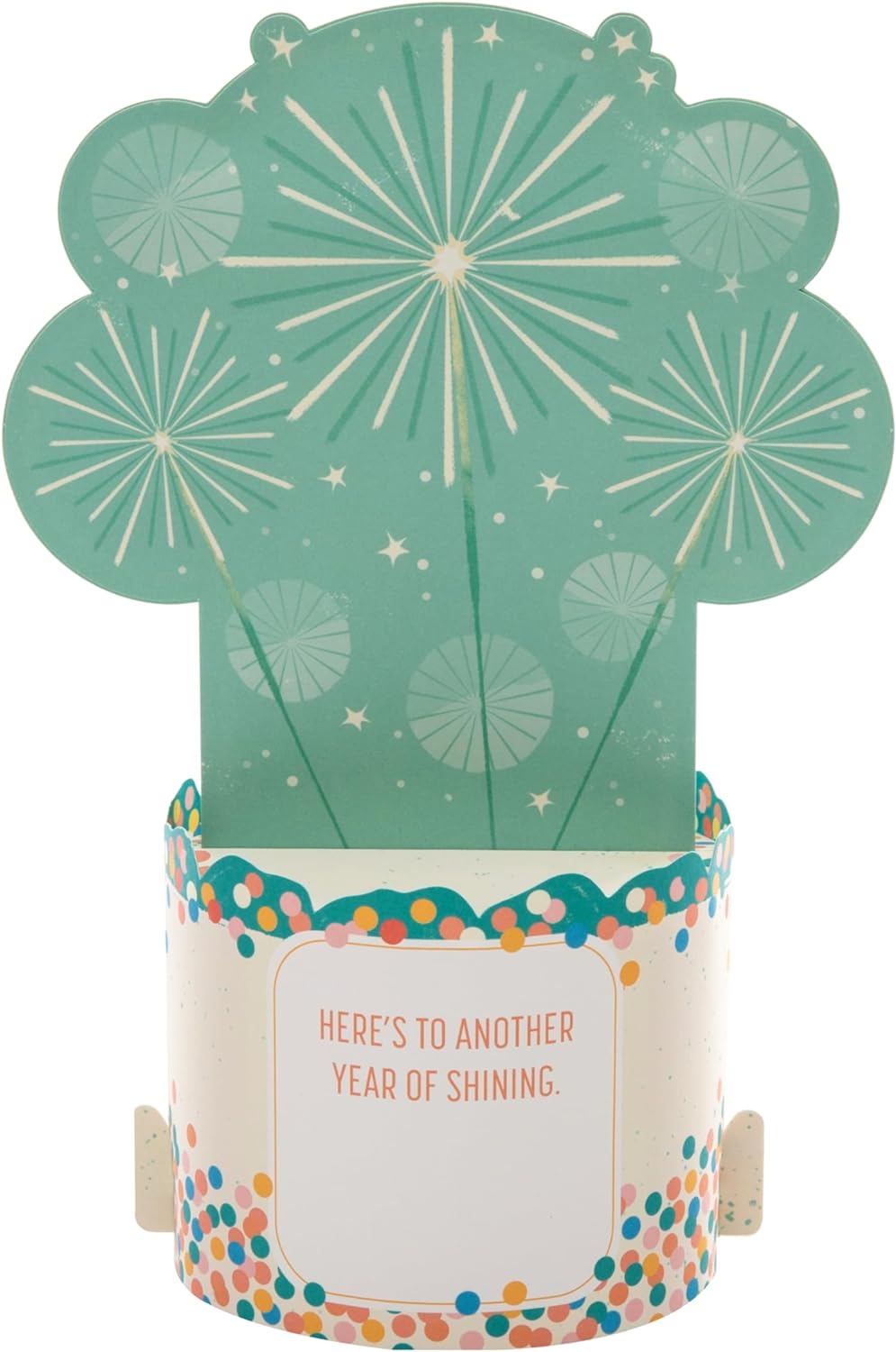 BIRTHDAY CARD: Celebrate their birthday with a bang with this amazing Hallmark 3D pop up birthday card! Transform their birthday into a cherished memory with a keepsake card. It’s not just a card, it’s a special moment that makes their day memorable. 3D BIRTHDAY DESIGN: This card pops up into a 3D diorama of a sparkler and confetti display. This card features the message 'Happy Birthday' on the front, a die-cut design, plays Happy Birthday music the centre spins for a truly unique experience. HIGH QUALITY CONSTRUCTION: This product is made using material from well-managed, FSC-certified forests and other controlled sources. WISHFUL MESSAGE: Write a special birthday wish they will love and accompany it with our birthday message, 'Here's to another year of shining'. The perfect way to add a personal touch and dazzle them with your love and joy. SIZE: This card measures 22.5 cm by 15.8 cm when flat and 22.5 cm by 15.8 cm by 10 cm when constructed. Accompanied by a Hallmark branded, blue envelope. Within UK 'Large Letter' Postage Size Limits. The perfect size to display. BATTERY WARNING. This is not a toy. KEEP OUT OF REACH OF CHILDREN. Do not dispose of batteries in a waste bin. Only discard electrical/electronic in a separate collection scheme which cater for the recovery and recycling of the materials contained within. Do not throw card into fire. Non changeable button cell batteries enclosed. If you think batteries might have been swallowed or placed into any part of the body, seek immediate medical attention.