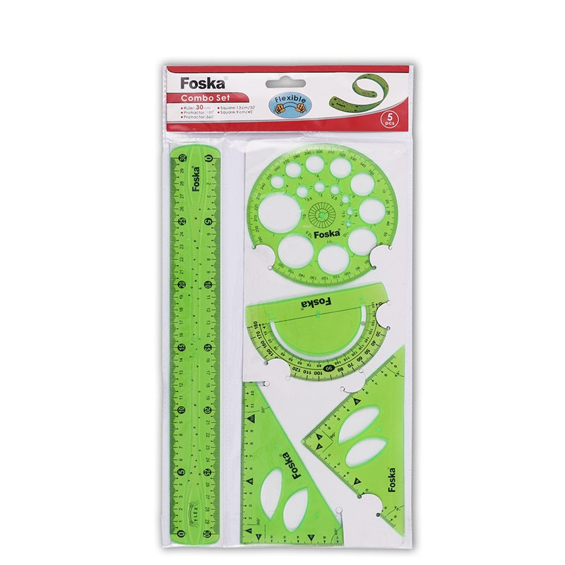 5 Pieces Plastic Flexible Geometric Set. Set Contain: Ruler: 30cm, Square: 13cm/30º, Square: 9cm/45º, Protractor: 10cm/180º, Protractor: 10cm/360º. Introducing our versatile 5 Pieces Plastic Flexible Geometric Set, meticulously designed to meet all your measurement and drafting requirements with precision and ease. This comprehensive set includes five essential tools: a 30cm ruler, a 13cm square with a 30º angle, a 9cm square with a 45º angle, a 10cm protractor with a 180º angle, and a second 10cm protractor with a full 360º angle. Crafted from durable plastic, each piece offers flexibility for effortless manipulation and accurate measurements, ensuring reliability and longevity in your projects. Whether you're working on geometry assignments, technical drawings, or creative designs, this comprehensive set equips you with the essential tools to bring your ideas to life with confidence and precision.