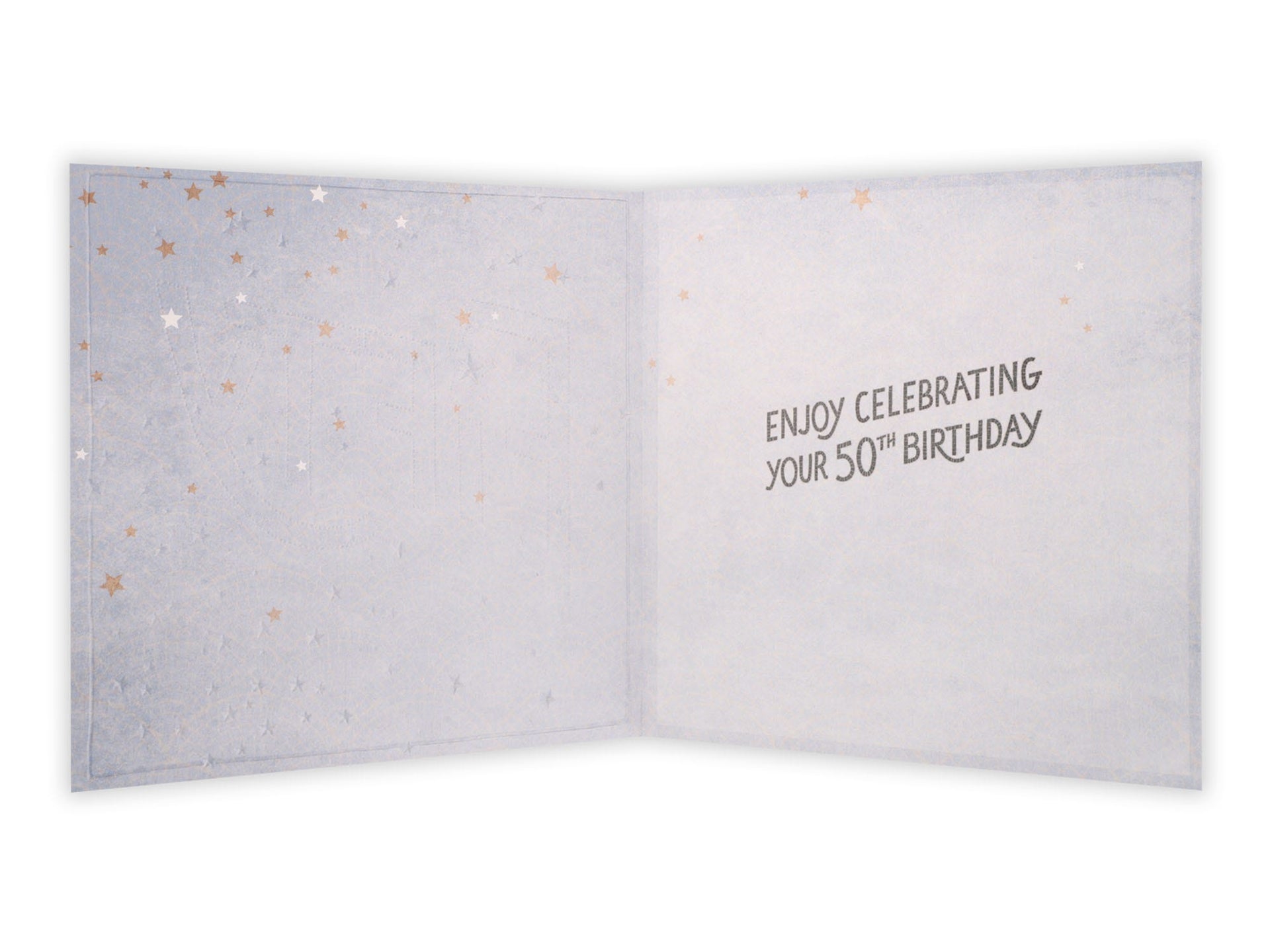 COVER MESSAGE: Fifty. INSIDE MESSAGE: Enjoy celebrating your 50th birthday. Envelope size: 159mm x 159mm. PACKAGE SIZE: Standard Letter.