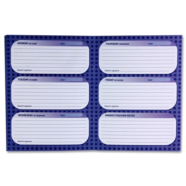 88 Pages Week to View Homework Purple Journal by Ormond. Keep a record of all your homework requirements with this useful Journal. Includes 88 pages, size 225mm x 170mm (8.9" x 6.7"). Comes with a purple laminated card front and back cover, with name and class. Week per double page shown and separated into days and area for parents or teachers signature. Useful personal information, timetable, diary, multiplication chart and Europe map at the front. This journal is undated so it can be started at any time during the year.