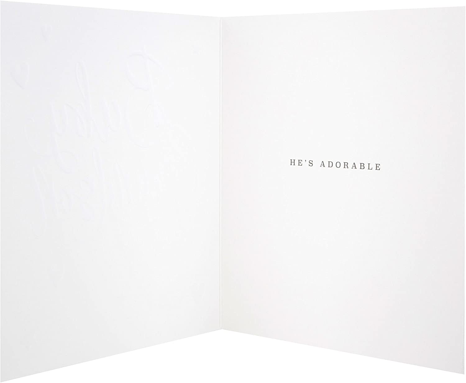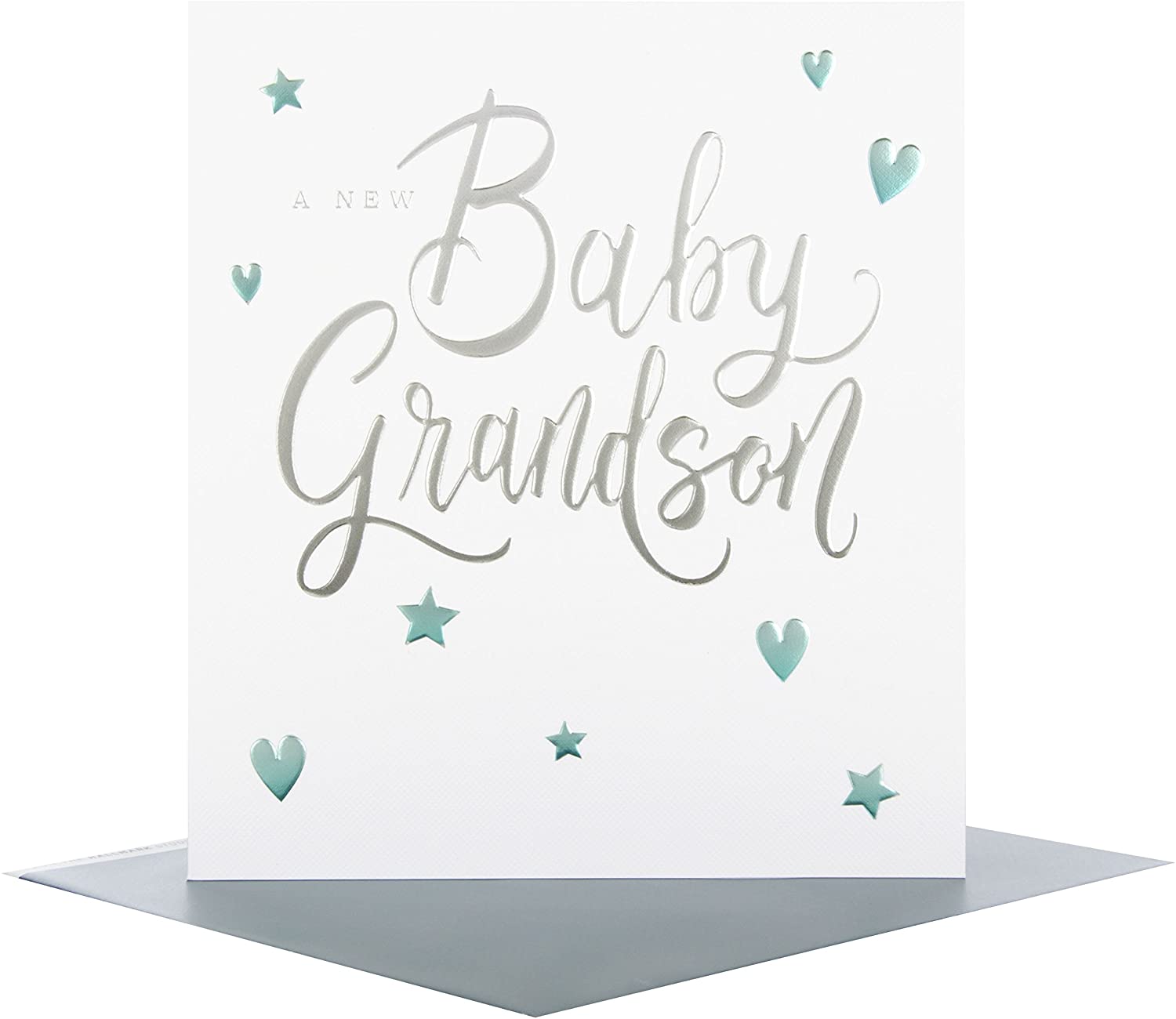 A New Baby Grandson Foil Finished Start and Heart Design Congratulation Card. Congratulate them on the birth of their Grandson with this contemporary card from Hallmark. Message inside card reads: 'He's adorable'. Finishes: Foil. Envelope: Teal. Size: 185 x 165mm.