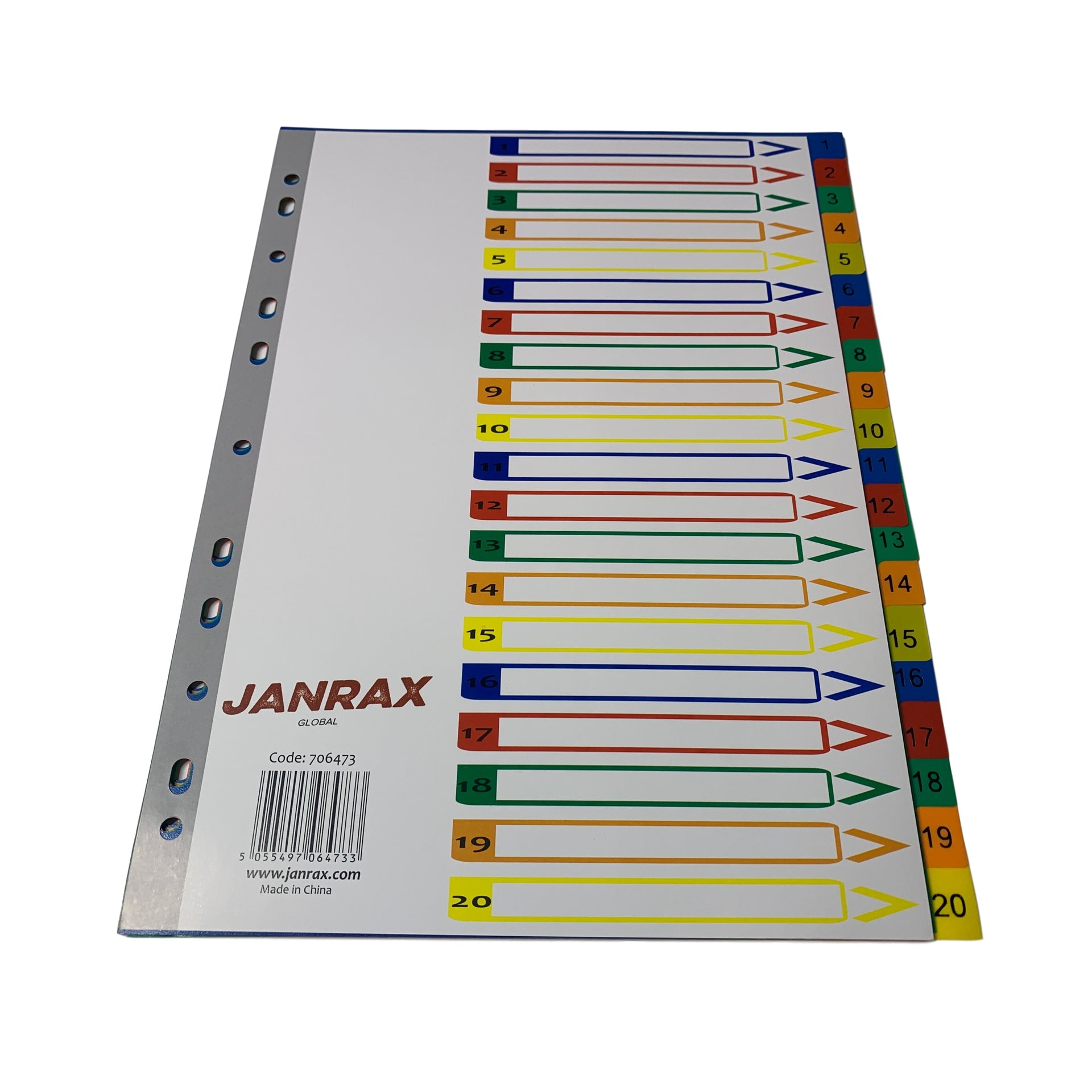 20 Part A4 Polypropylene Dividers with Reinforced Index Cover by Janrax. Multipunched 120 Micron Hard wearing A4 PP sheet dividers. Assorted colour tabs for quick identification. The front index sheet provides space for labelling to make referencing quick and easy. Made from tear-resistant, wipe clean polypropylene.