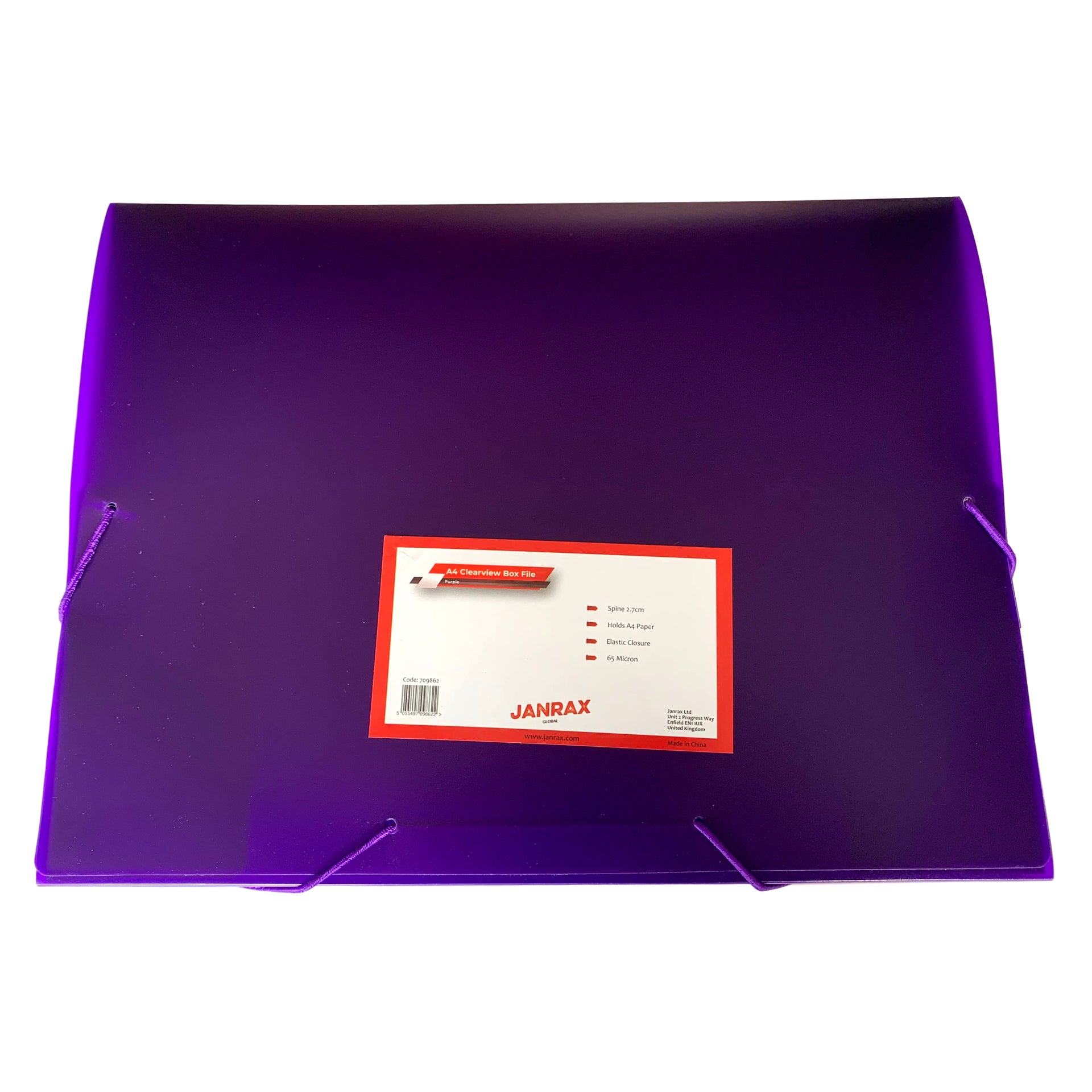 A4 Clearview Purple Box File with Elastic Closure. Spine 2.7cm. Holds A4 Paper. Elastic closure to keep documents secure. 65 Micron.