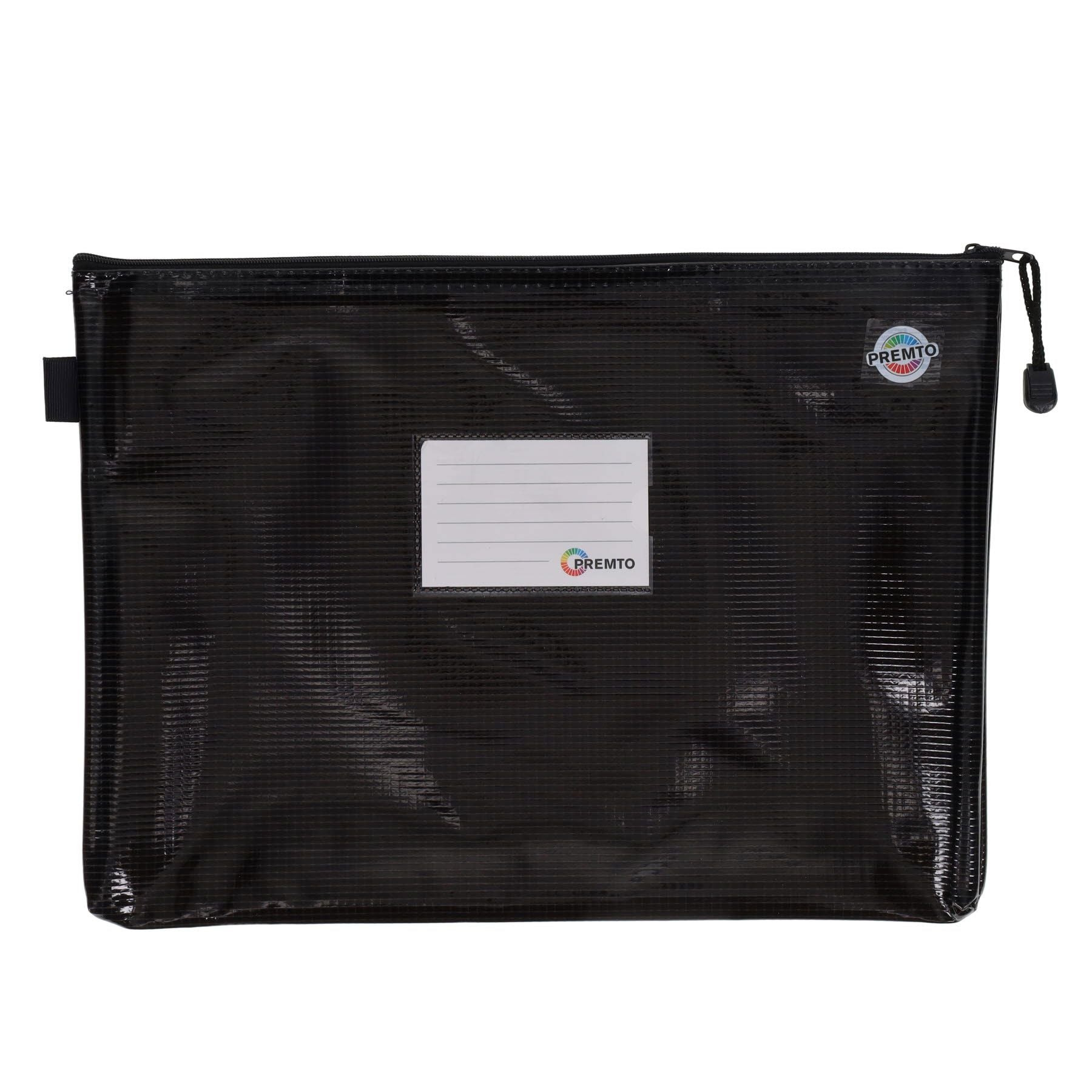 A4+ Extra Durable Jet Black Mesh Storage Wallet by Premto. Approx Size: 350 x 260mm. Storage wallet with zip closure. Smart envelope design. For use in schools, at home and in the office. Holds Paper, Magazines, Stationery items, Brochures, Projects, Documents, Calculators etc.