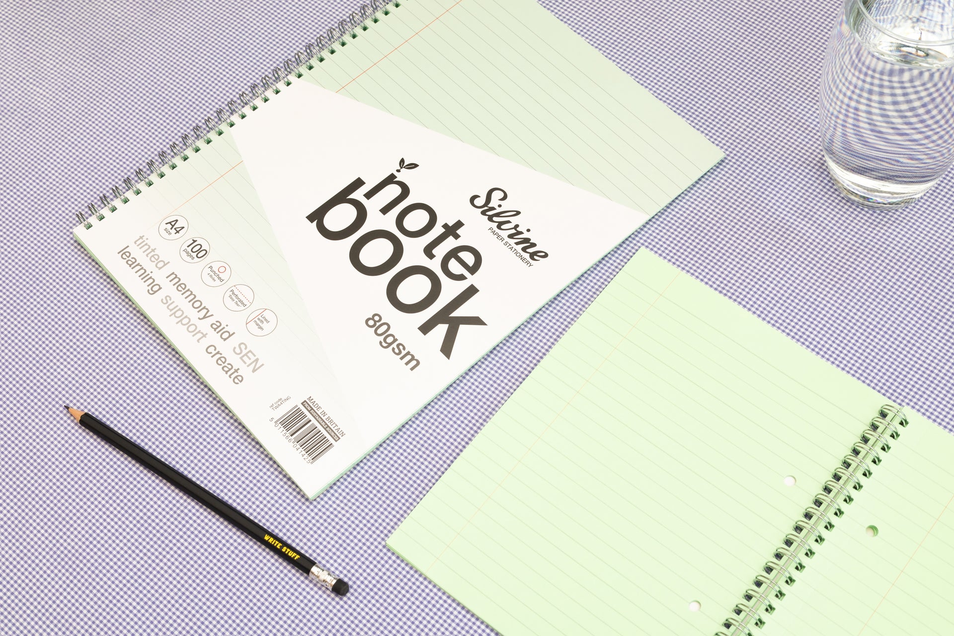 Silvine A5 Green Paper Dyslexia Notebook - Lined with Margin (100 Pages). Specifically designed with green tinted paper, our premium 80gsm wirebound notebook reduces visual stress and enhances focus, making it an ideal memory aid for SEN supportive learners. Visual aid notebook with feint ruled lines and margin which subtly fade into the background to ensure your writing stands out, promoting better focus and clarity. The robust wire binding allows the notebook to lay perfectly flat for comfortable writing on any surface, while punch holes and micro-perforations enable easy organization and filing. This A5 green tinted notebook offers 100 pages of high-quality 80gsm paper for longer study sessions, note-taking, and assignments; covering your academic and professional needs. Slightly larger than standard A5, removed pages remain full-size ensuring seamless filing in folders and binders. Finished notebook dimensions - Sidebound 212 x 159.5 mm.