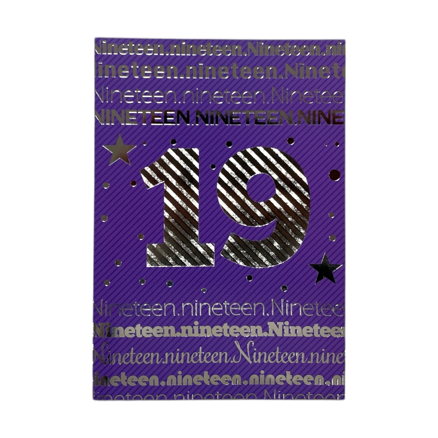 The card features a stylish purple background with silver typography. The number "19" is prominently displayed in a bold, patterned font. Surrounding it, the word "Nineteen" is repeated in different sizes and styles, creating a modern and dynamic design. Small stars and decorative elements add to the festive feel. It comes complete with a coordinating envelope. Card size: Approx. 19.5 x 14 cm.