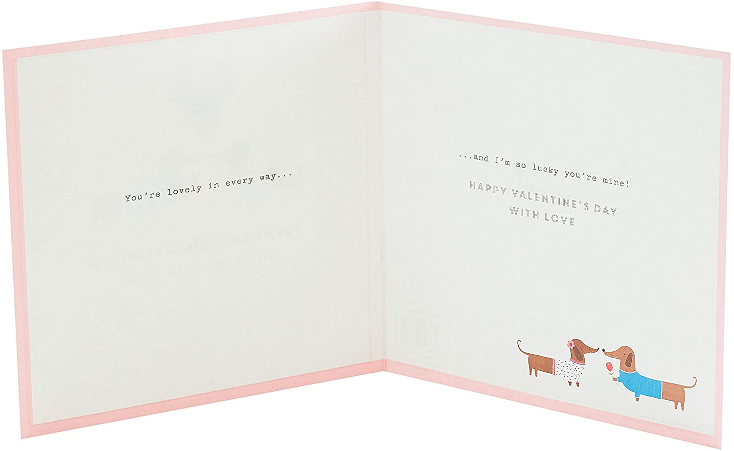 This extra-cute sausage dog card is the perfect way to wish your girlfriend a happy valentine's day. Message inside reads: you're lovely in every way and i'm so lucky you're mine! happy valentine's day with love. Card size: 186 x 186mm. Envelope included.