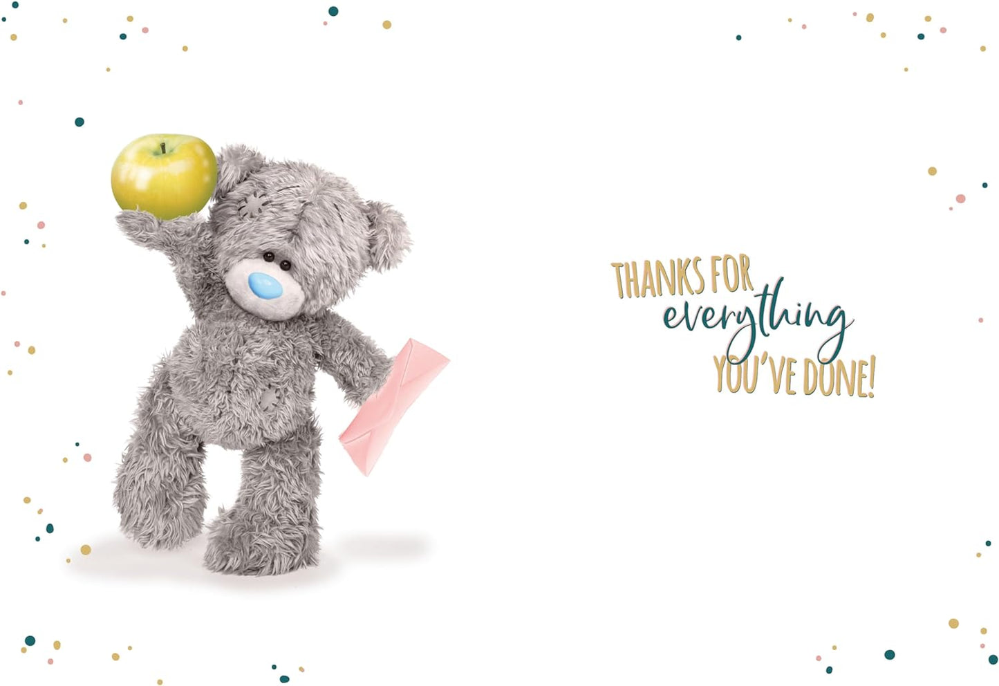 SAY THANK YOU TO A BRILLIANT TEACHER - whether it's the end of term or your child is moving on to a new school, this card is a great way of saying thank you to hard-working staff FUN PHOTO FINISH ARTWORK - The photo-real design shows Tatty Teddy holding a crunchy green apple with bold lettering to give a vibrant contemporary feel THOUGHTFUL MESSAGE - the words on the front cover read 'Thank you to a super teacher, you're the best' and the inside message reads 'Thanks for everything you've done!' PREMIUM QUALITY CARD AND ENVELOPE - made from highest quality materials, with love and care, this special card is sure to be cherished. Size: 5X7"
