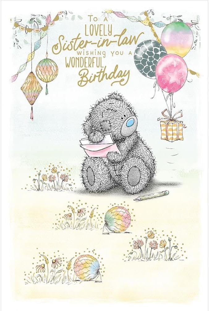 PREMIUM BIRTHDAY CARD FOR A SISTER-IN-LAW - This gorgeous design is perfect for sending birthday wishes to a much-loved sister-in-law as she celebrates her special day ORIGINAL ME TO YOU ARTWORK - the hand sketched illustration shows Tatty Teddy sealing an envelope as a gift floats away on three balloons! Design details include luxury gold foil lettering and a pretty backdrop of bunting and rainbow lanterns Bday Sister In law Bear With Envelope And Balloon AFFECTIONATE WORDS - Cover message: To a lovely sister-in-law, wishing you a wonderful birthday Inside message: With lots of love