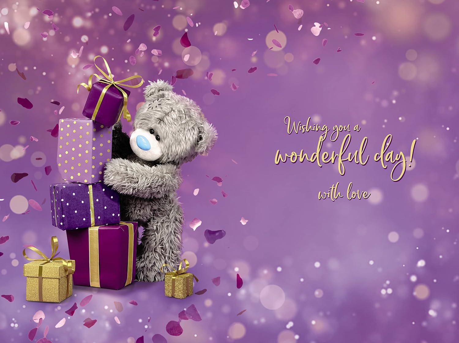 Celebrate a friend or loved one's 40th in style with this adorable card from the creators of Me to You. Featuring a cute photo-real image of Tatty Teddy holding a stack of beautifully wrapped gifts, this special card has a 3D lenticular finish, so with slight movements Tatty Teddy starts to move too. THOUGHTFUL MESSAGE - the words on the front of the card read simply 'On Your 40th Birthday', and inside the message reads 'Wishing You a Wonderful Day! With Love' Size: 6"x 9"