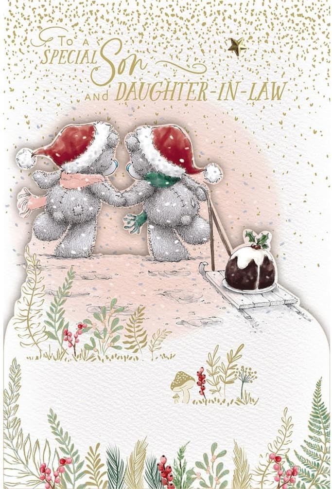 LUXURY CHRISTMAS CARD FOR A SON & DAUGHTER-IN-LAW - with its enchanting illustration, die cut detail and gold gem embellishment, this beautiful design is sure to touch the heart of your brilliant son and his wife this Christmas UNIQUE TATTY TEDDY ARTWORK - the bespoke hand sketched drawing shows two Tatty Teddy bears sharing festive fun together, with a magical backdrop of twinkly stars and seasonal foliage LOVING MESSAGE - the words on the cover read 'To a special son and daughter-in-law' and the message inside reads 'You both deserve a Christmas that is filled with so much more...fun, love and laughter than you've ever wished for. Merry Christmas With lots of love' PREMIUM HANDMADE CARD MEASURES 6x9ins - made from highest quality materials, with love and care, this stunning design is guaranteed to stand out!