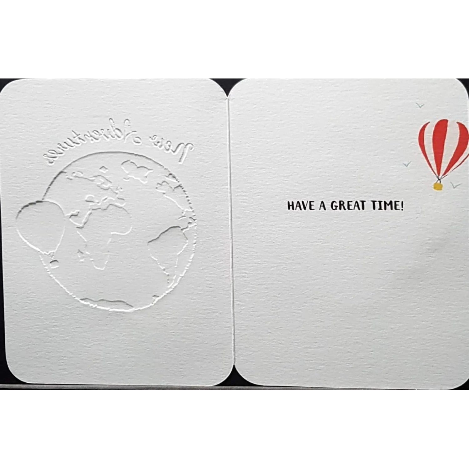 New Adventures Goodbye and Good Luck Card. Outside the card reads 'New Beginnings New Adventures' and 'Goodbye & Good luck x' Inside the card reads 'Have a great time!' Card size 11.7cm x 15.7cm. Card supplied with black and white striped envelope.