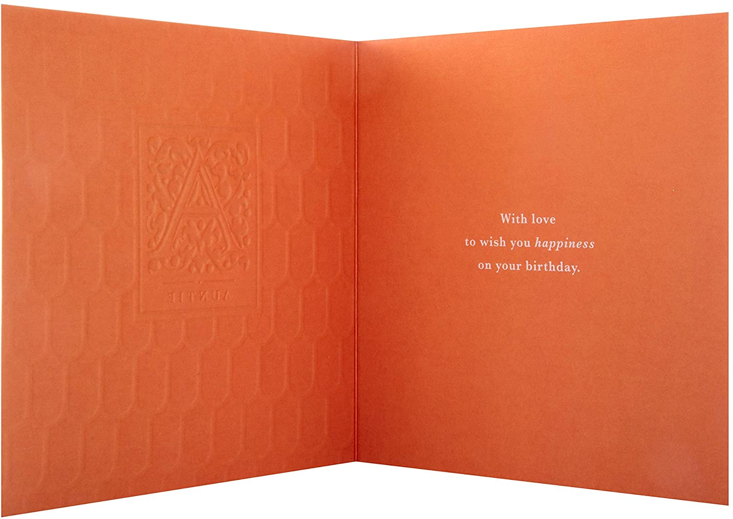 An elegant way to wish a special Auntie a wonderful day, This beautifully embossed birthday card from Hallmark has a timeless appeal. Embossed design. Holographic Foil lettering and details. Co-ordinating Kraft effect envelope. Message reads: front: Auntie inside: with love to wish you happiness on your birthday. Measures 16cm by 16cm, within Standard UK 'Letter' Size limits