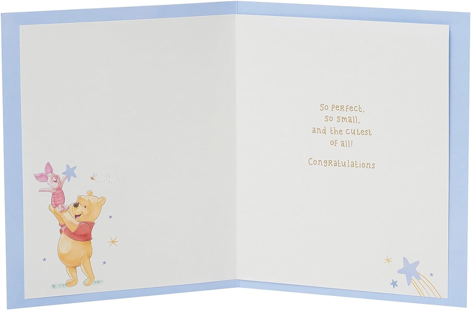 Say hello to the new baby boy with this cute Disney Winnie the Pooh card, embossed with gold foil. It is illustrated with Pooh bear asleep on the moon. Message Inside Reads: So perfect, so small, and the cutest of all! Congratulations. Card Size: 159mm x 184mm. Envelope Included.