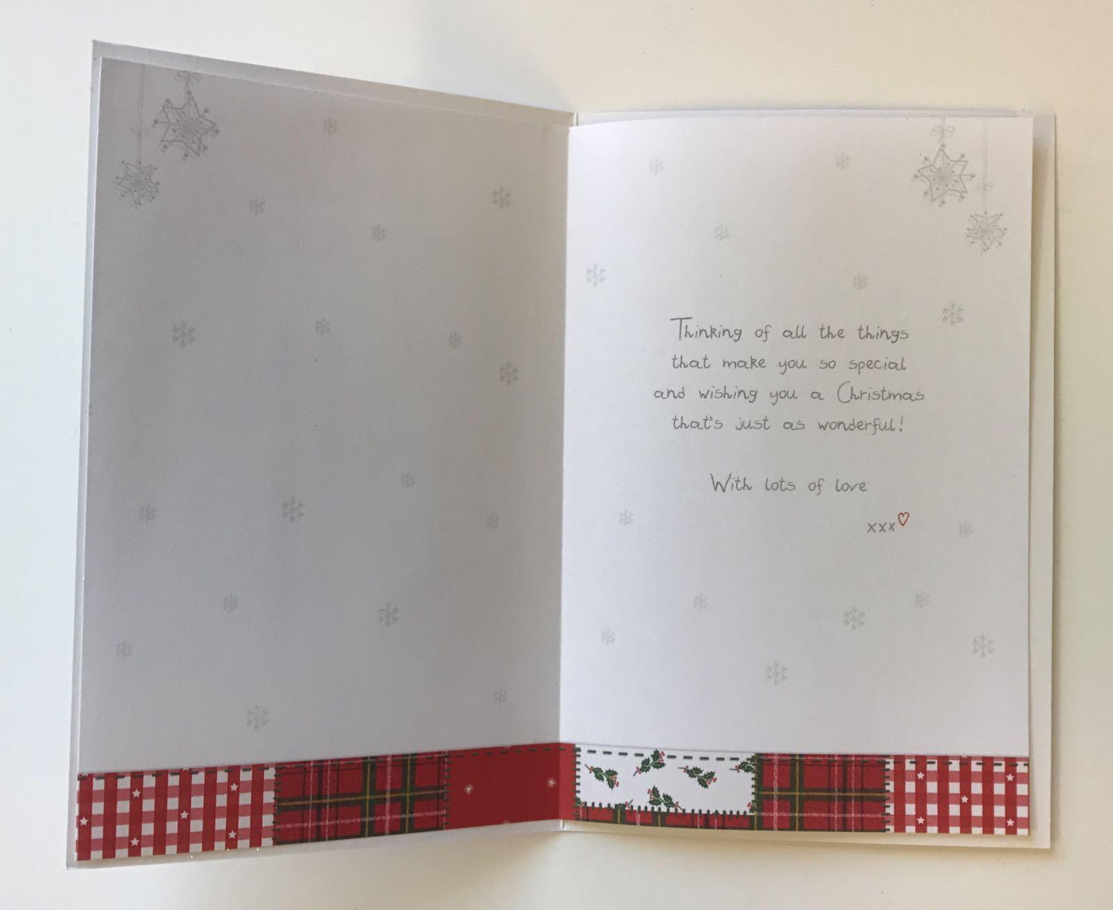 Front Wording: For A Wonderful Great Granddaughter. Inside Verse: Thinking of all the things that make you so special and wishing you a Christmas that's just as wonderful! With lots of love xxx Finish: Matt, Embossed with Glitter and Matching Insert. Dimensions: 185 x 120mm