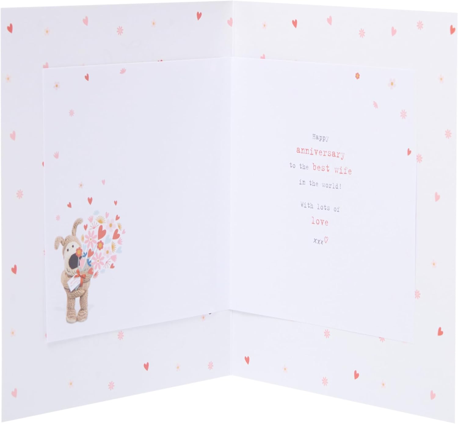 Celebrate the best wife in the world with this adorable Boofle wedding anniversary card. Featuring a cute dog with a bouquet, it’s accented with gold foil details and finished with a wraparound raffia ribbon. Message Inside Reads: Happy anniversary to the best wife in the world! With lots of love Card Size: 15.9cm x 18.4cm | Envelope Included
