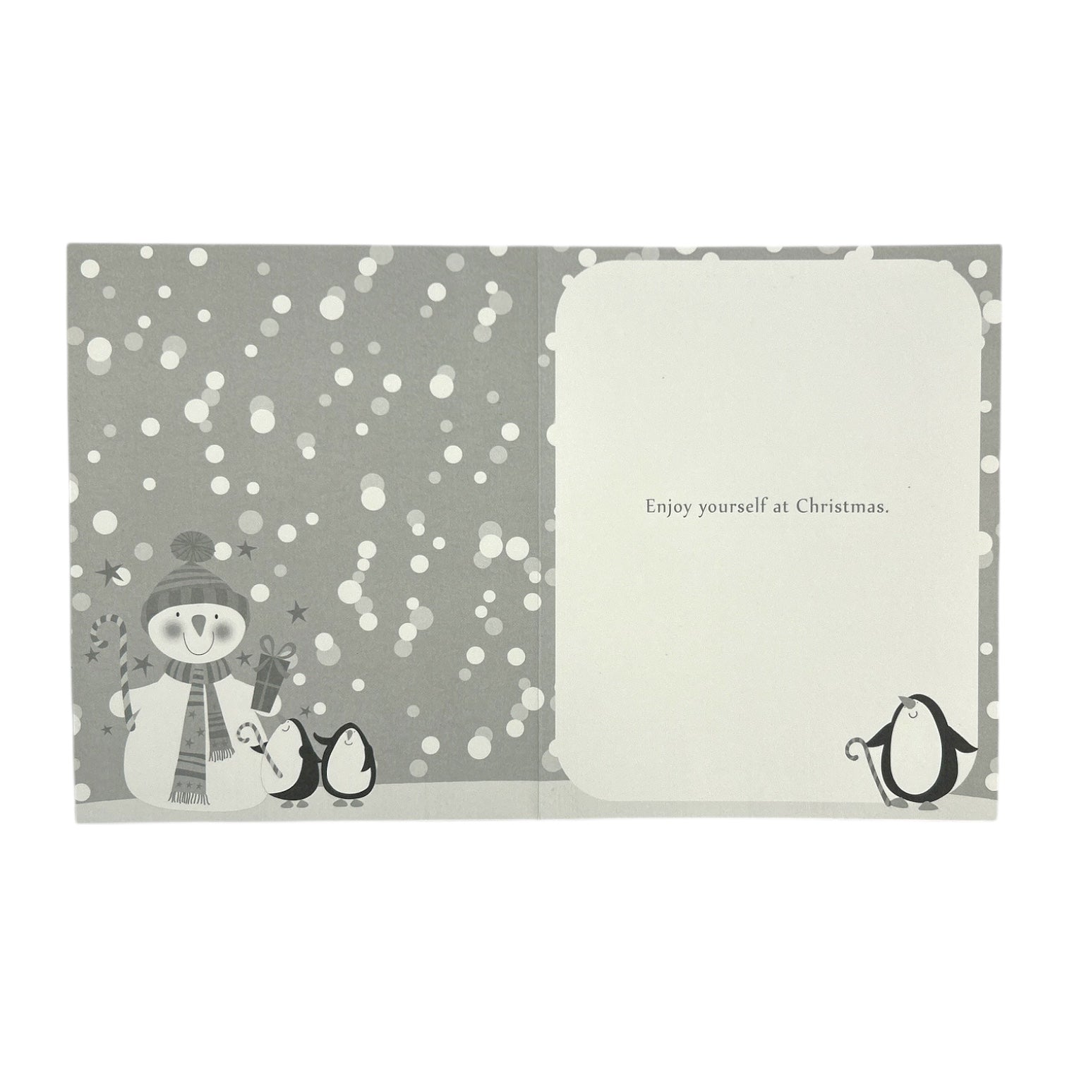 This box of 24 Christmas cards. Features two delightful designs showcasing a cheerful snowman and playful penguins, one in a cool blue/green palette and the other in festive red. Each card is finished with a luxury glitter coating for added seasonal sparkle. With joyful inside messages—“Enjoy yourself at Christmas” and “Have fun this Christmas”—these cards are perfect for spreading holiday cheer to friends and loved ones.