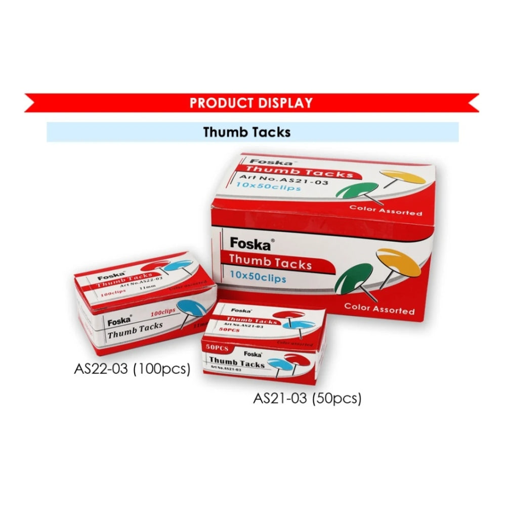 Bulk Pack of 1000 Assorted Colour Thumb Tacks by Foska. Colours include blue, red, yellow, white and green. Width of head: 11mm. Ideal for school, offices and home. 10 Pack of 100 push pins will be supplied.