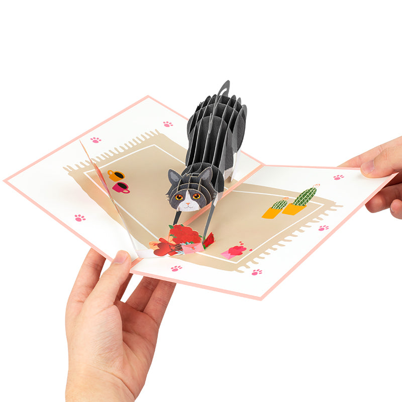 Delight any cat lover with this 3D pop-up greeting card featuring a lovable black and white cat holding a bouquet of red roses, creating a playful and festive atmosphere for your special occasion. The card showcases a heart-shaped cutout and a vibrant pink background, perfectly blending fun and romance for Valentine’s Day, anniversaries, or romantic celebrations. The pop-up elements are beautifully crafted with meticulous attention to detail, bringing the cat and roses to life in a realistic and heartwarming scene. Ideal for cat lovers, this whimsical card also works wonderfully as a birthday or interactive 3D greeting card. Measuring 15 x 20 cm, the set includes a small blank insert (8.5 x 13 cm), providing space to write a personalized message.