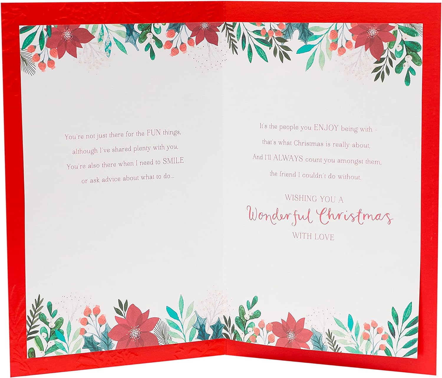 The information below applies to each unit in the pack Thank your friend for everything you share with this heartfelt Christmas card, printed on premium quality board and finished with gold foil, gems and a bow. Message inside reads: It's the people you enjoy being with, that's what Christmas is really about, And I'll always count you amongst them, the friend I couldn't do without. Wishing You a Wonderful Christmas with Love Envelope included Christmas card for friend Card size: 149mm x 229mm. 6 Card and 6 envelope