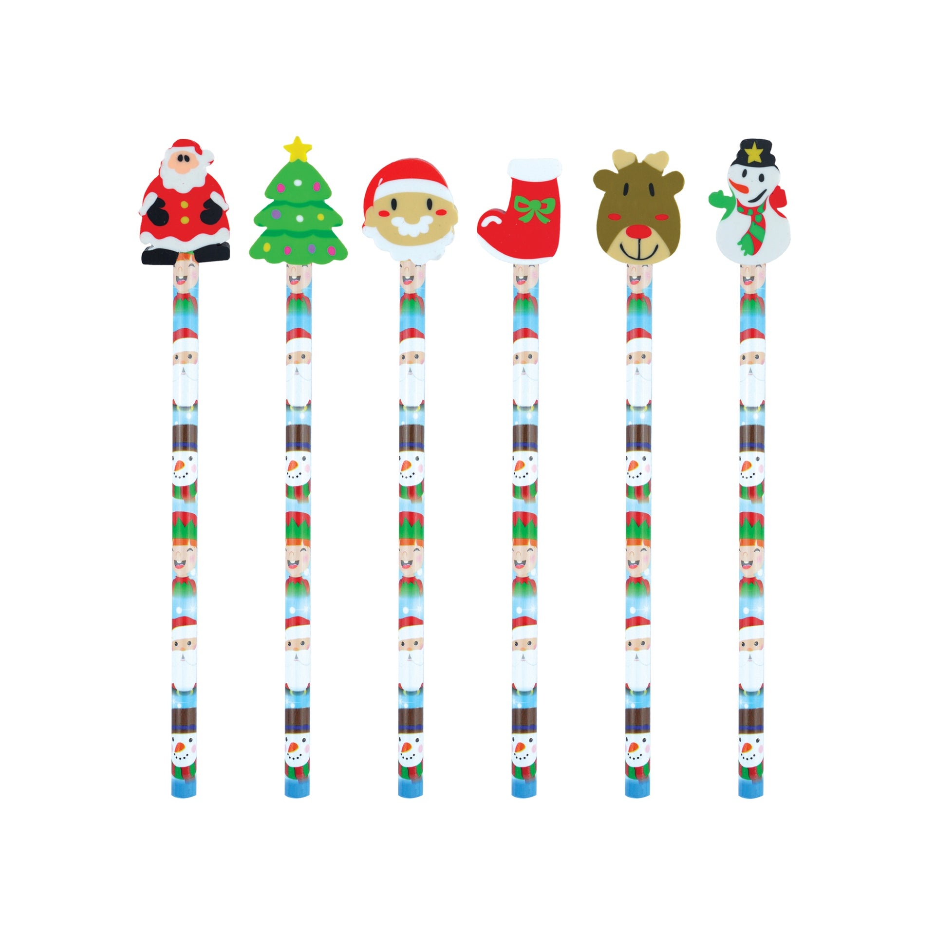 These Christmas pencils with eraser toppers are ideal party favours and stocking fillers. 6 assorted topper designs including Santa, snowman and reindeer. One random design will be supplied.