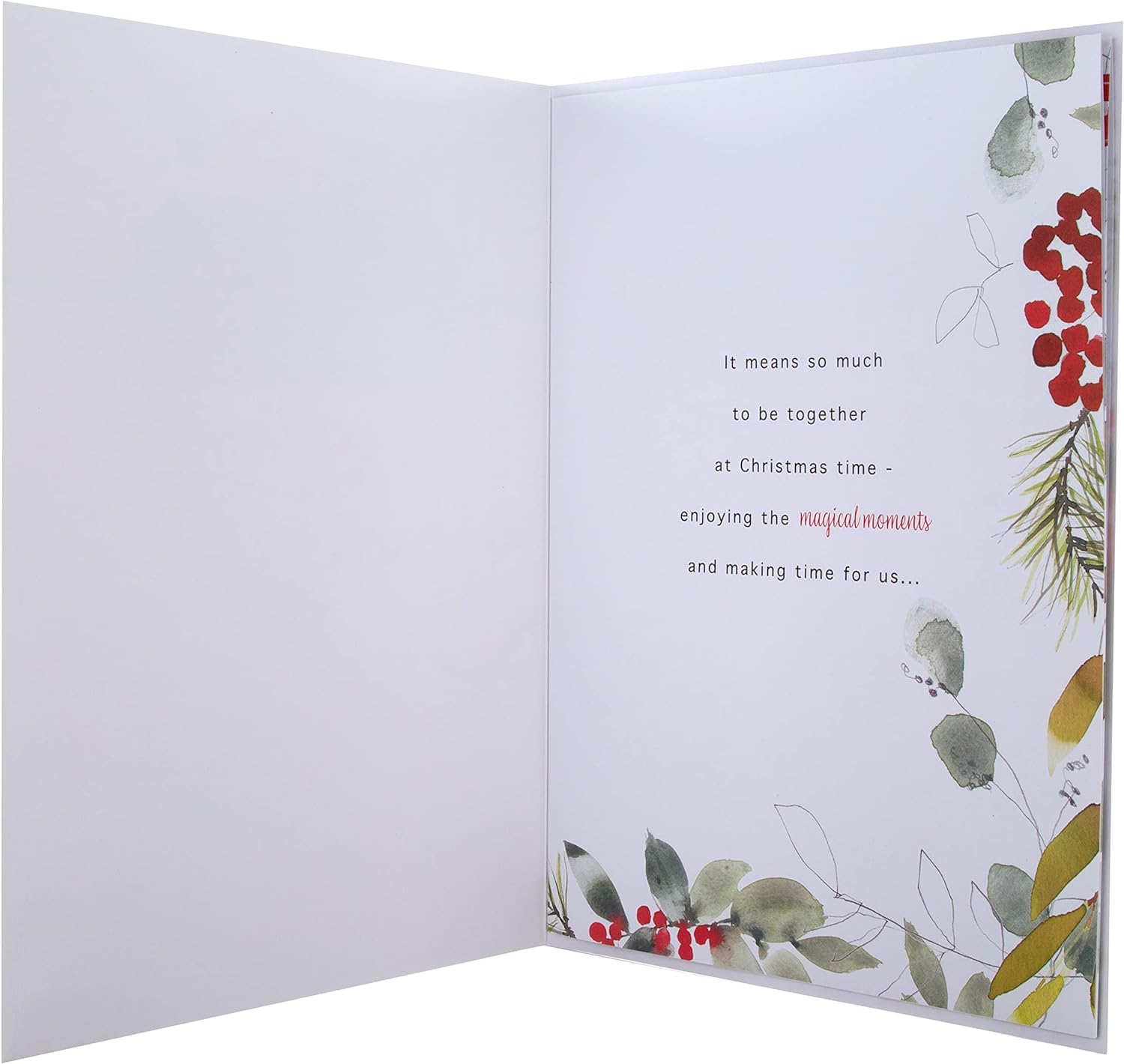 Give your lovely Wife a Christmas she deserves, filled with wonderful memories, lots of love and hugs, all wrapped up with this stunning Christmas card, from Hallmark. Printed on high-quality 350gsm board, this card features a paper insert, gold foil details, silver foil details, gold paper heart gems, a 3D attachment and a gold paper raffia bow, comes complete with a white, plant patterned presentation gift box, and a pair of green seals Cover Text on Card Reads: For my lovely Wife at Christmas time - A special message just for you Message Inside Card Reads: It means so much to be together at Christmas time - enjoying the magical moments and making time for us... It reminds me how grateful I am for you and your love all year round... That's why at Christmas I just want to say, thanks for everything - I love you very, very much. Let's share a happy Christmas This card is fully recyclable, and made of material from well-managed, FSC-certified forests and other controlled sources. Comes complete with a white, plant patterned gift box Card Measures: 30.5 cm by 21.9 cm, Gift Box Measures: 32 cm by 23 cm by 2 cm; Suitable for hand-delivery