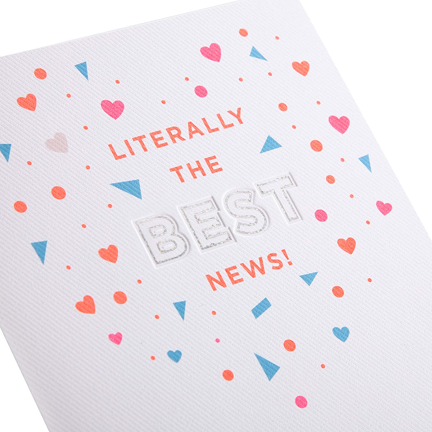 Heard some amazing news that needs celebrating? Then this fantastic Engagement card from Hallmark could be just what you're looking for! Vibrant 'confetti' Design. Neon inks. Embossed lettering with holographic foil highlights. Matching neon orange envelope. Message reads: front: literally the best news! Inside: congratulations on your Engagement. Measures 16.2cm by 13.5cm, within Standard UK 'Letter' Size limits.
