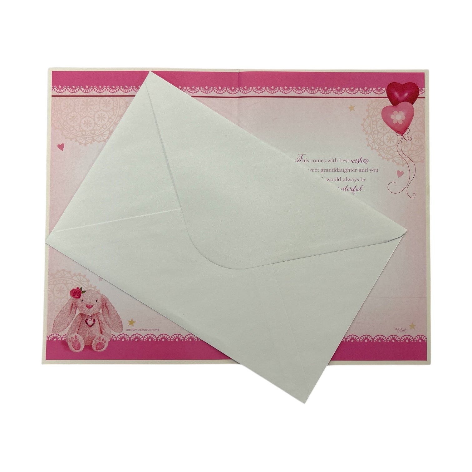 A new Granddaughter is most definitely something to celebrate so send your congratulations with this lovely card from Xpress Yourself. Keepsake treasures greeting card stunning design with luxury finishes with detachable plastic keepsake attachment. This beautiful card is delicately finished with foil and glitter, and features a sweet bear, balloons, pink banner on the front with detachable plastic keepsake small card and heartfelt message inside. The card comes with a coordinating envelope. Greetings cards approx. size 19 x 13.3 cm.
