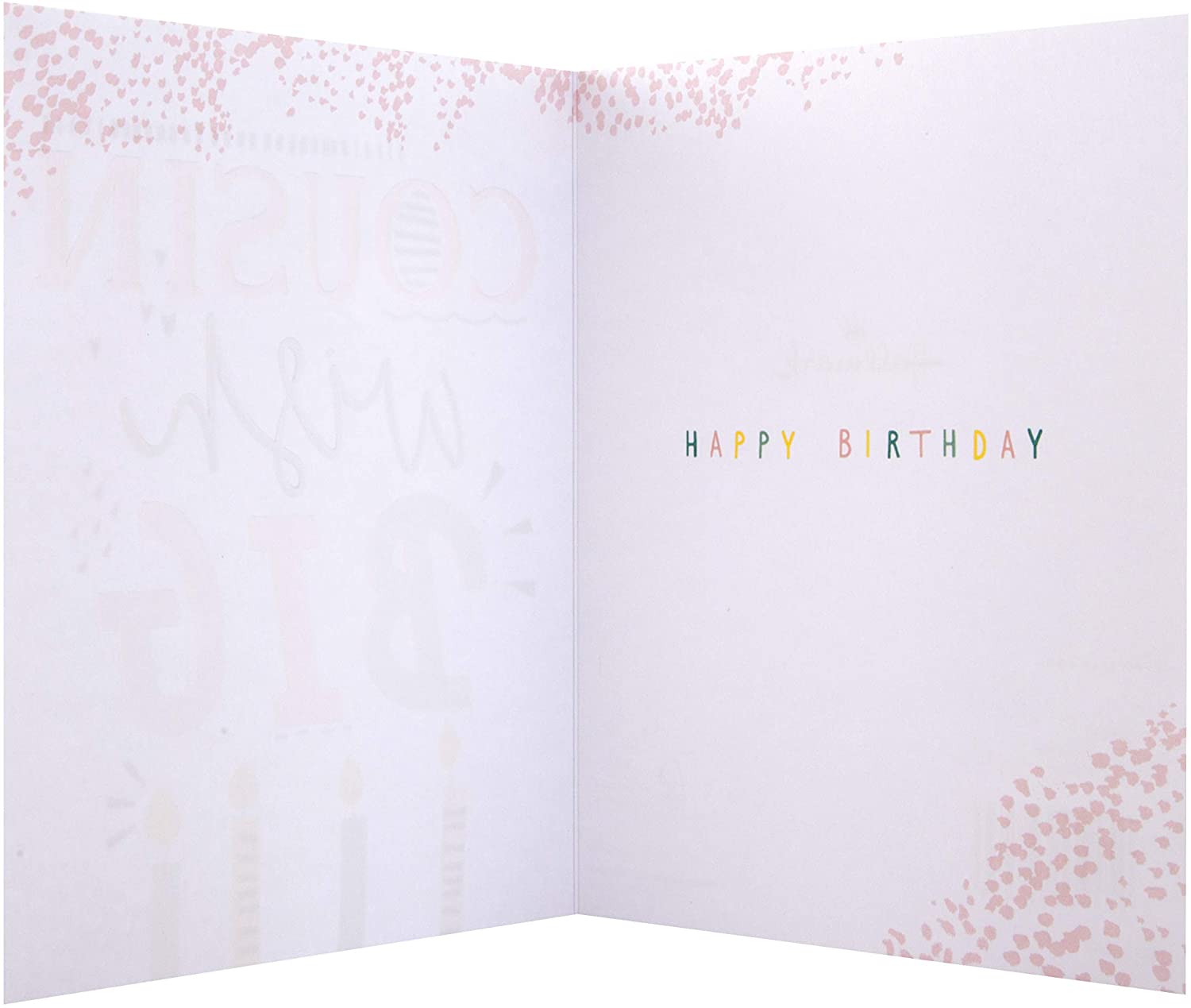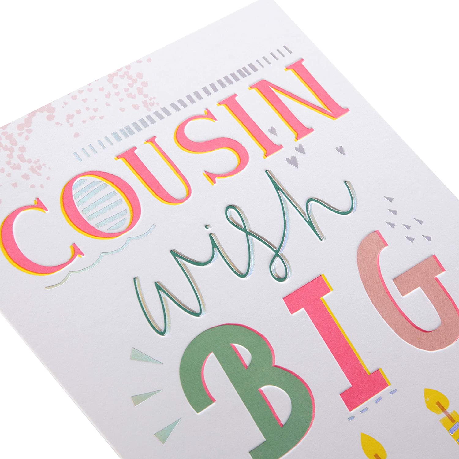 Brighten up your cousin's birthday with this vibrant contemporary card from Hallmark. Embossed lettering. Neon inks. Holographic Foil lettering and details. Co-ordinating Kraft envelope. Message reads: front: cousin, wish big inside: happy Birthday. Measures 16.2cm by 13.5cm, within Standard UK 'Letter' Size limits