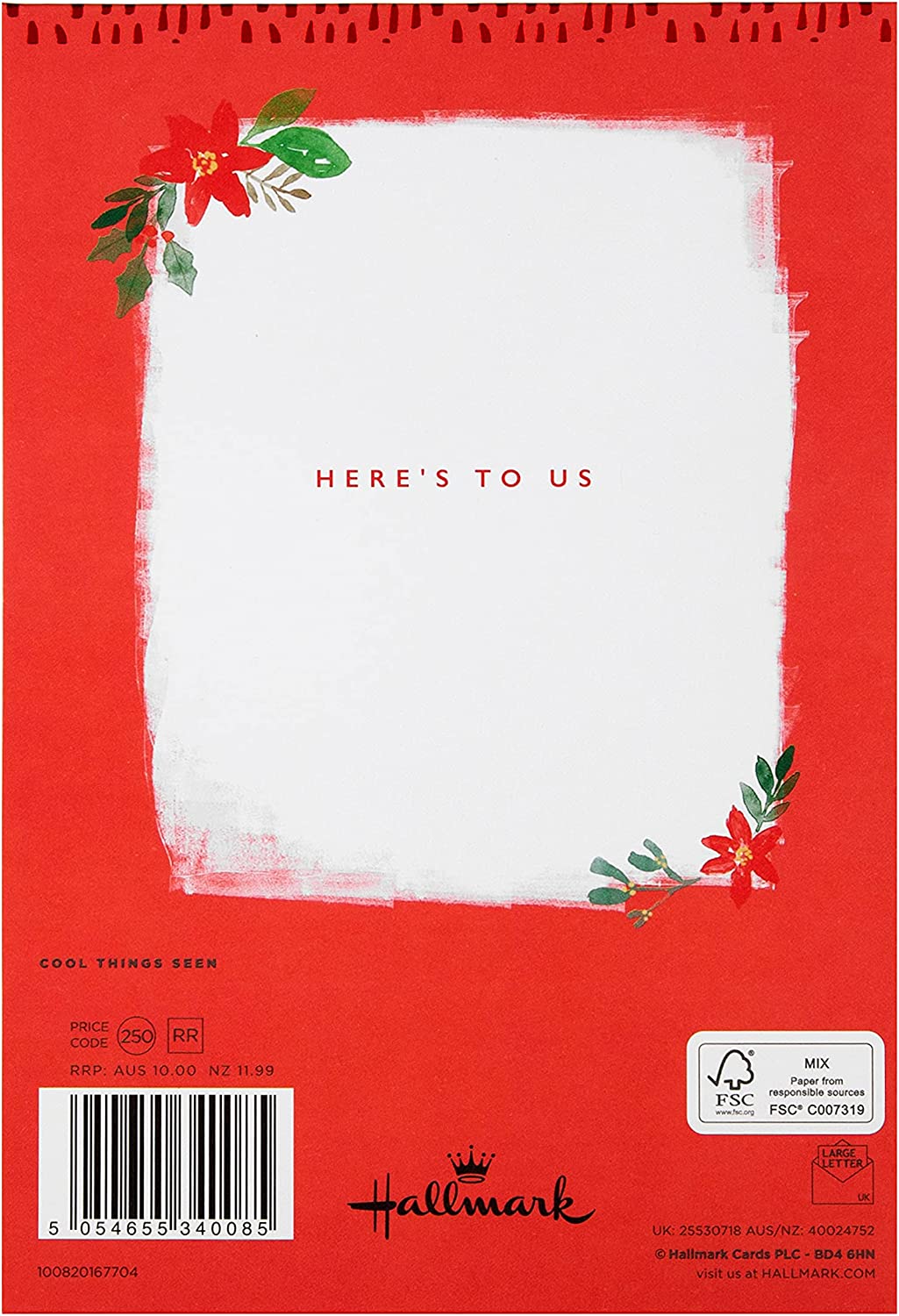 Celebrate the year round joy of the love between you and your wife, with this simple yet eye-catching 3D card from Hallmark. Made Using Material from Well-Managed, FSC Certified Forests and Other Controlled Sources. Features Silver and Red Foil Details and a Clever 3D Design, with a Hanging Bauble Element featuring a Grey and White Twine Hanging Loop, a Gold Paper Tassel Attachment and Die-cut Elements. Card Comes Complete with a Co-ordinating Orange Patterned, Hallmark Branded Envelope. Message on Back Reads: Here's to us. Measures 20.2cm by 13.8cm, Within Standard UK 'Large Letter' Size Limits.