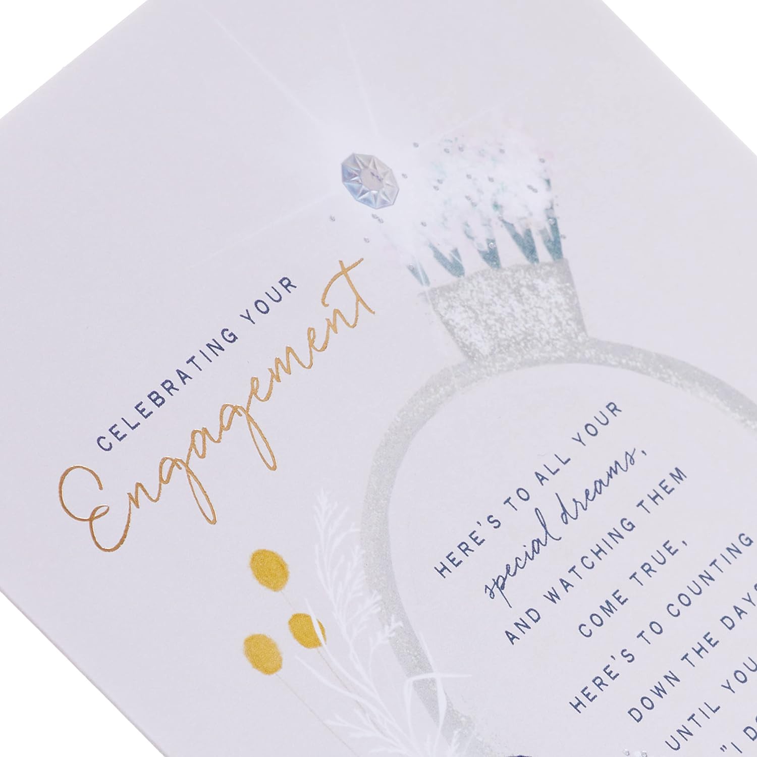 Add extra sparkle to their exciting engagement announcement with this flourishing flower engagement card from Hallmark. This card is fully recyclable, and made of material from well managed, FSC certified forests and other controlled sources Printed on high-quality board with embossed silver and gold foil detailing and a beautiful 3D floral design add-on; the card comes complete with a coordinating Gold, Hallmark Branded Envelope. Message Inside Reads: Here's to all the happiness that you have found together - Here's to your engagement and the love you'll share forever. Congratulations. Measures: 22.8 cm by 15.9 cm; Within Standard UK Letter Size Limits