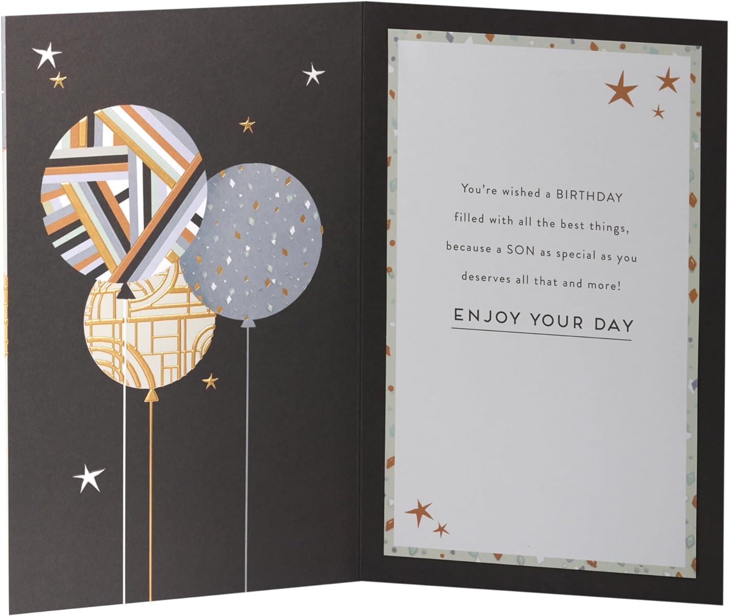 Wish your son a very happy birthday with this stylish card, featuring a balloon design accented with gold foil detailing and embossed elements. Message Inside Reads: You're wished a birthday filled with all the best things, because a son as special as you deserves all that and more! Enjoy Your Day. Card Size: 149mm x 229mm. Envelope Included. This product is FSC-labelled, meaning you’re supporting responsible forestry and helping fight climate change, protect biodiversity, and support communities.
