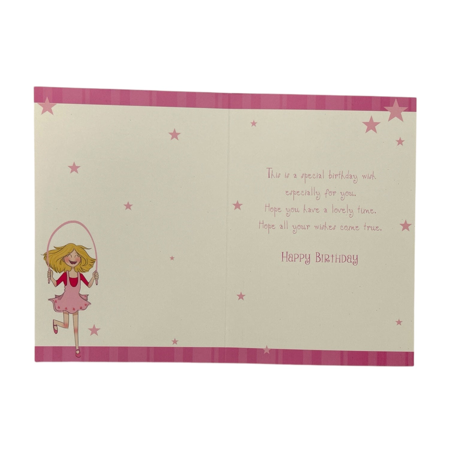 This Cousin Birthday Greeting Card is a delightful and energetic celebration of a special day. The design features a cheerful girl with blonde hair, joyfully jumping rope, capturing a sense of fun and excitement. Her bright expression and playful pose convey happiness and celebration, making the card perfect for a beloved cousin. A pink glitter effect enhances the jump rope, her outfit, and the surrounding stars, adding a touch of sparkle and magic to the design. The words "Happy Birthday Cousin" are elegantly displayed in golden text above the girl, creating a warm and festive touch. The combination of playful movement, glittering accents, and a heartfelt message makes this card a wonderful way to celebrate a cousin’s birthday. Birthday wishes are included inside, making it even more special. The card comes with a coordinating envelope. Card size: Approx. 19.5 x 14 cm.