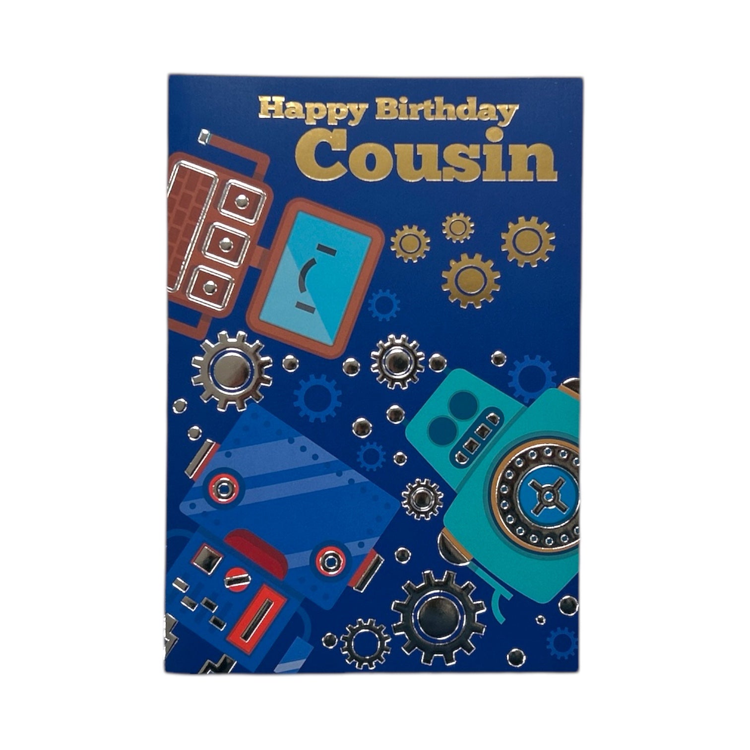 This is a "Happy Birthday Cousin" greeting card with a fun and playful design. The card features a deep blue background decorated with colorful robots and golden gears, giving it a mechanical and futuristic feel. It’s perfect for a cousin who loves robots or technology.  It comes complete with a coordinating envelope. Card size: Approx. 19.5 x 14 cm.