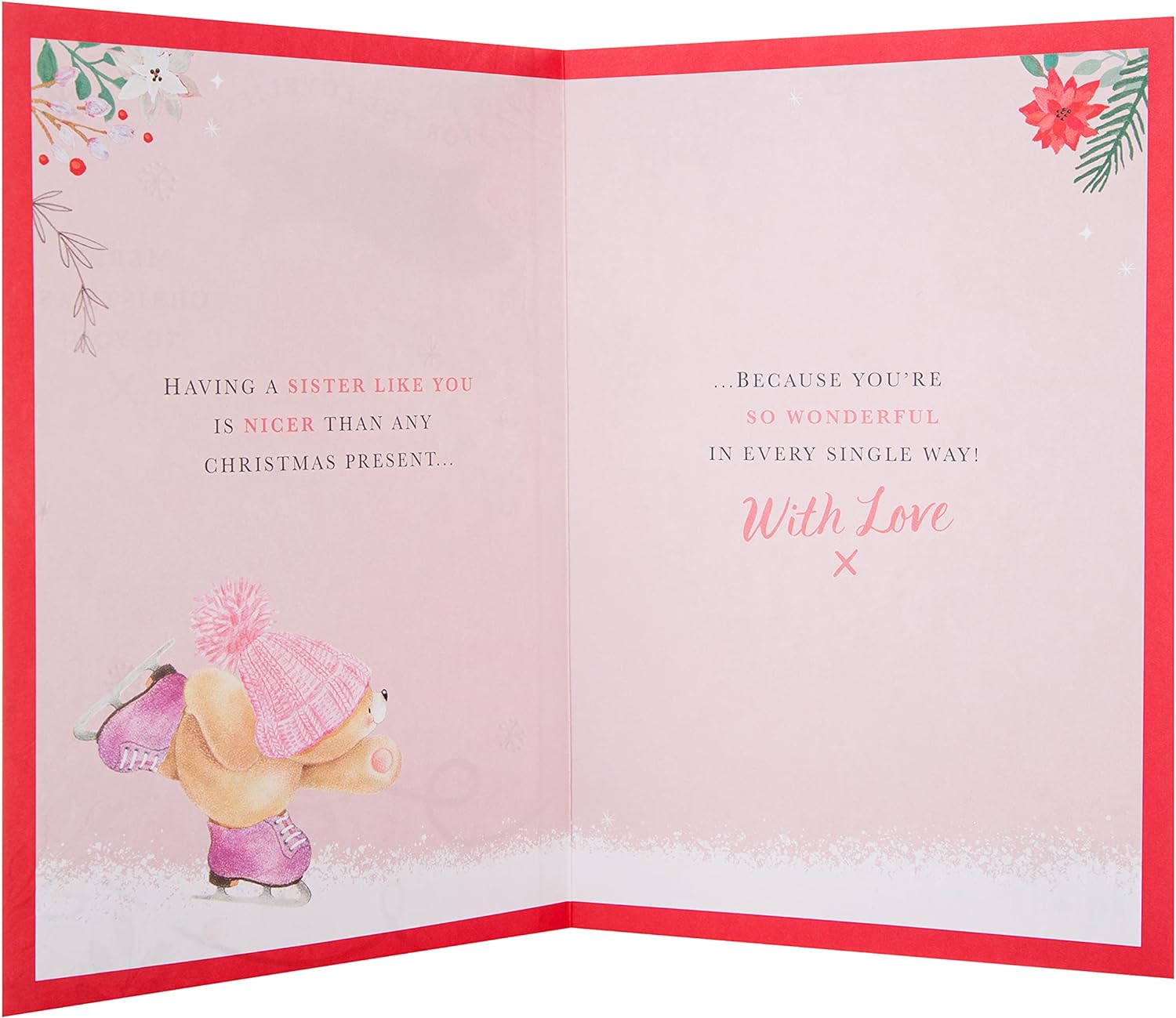 Share a warm festive wish with your sister at Christmas time, with this gorgeous Forever Friends card from Hallmark This card is fully recyclable, and made of material from well-managed, FSC-certified forests and other controlled sources. Features An Embossed Design, with a 3D Effect Banner Attachment, Gold Foil Lettering and Design Details, and a Pink Twine Element Comes Complete with a Co-ordinating Hallmark Branded, Kraft Envelope Message Inside Reads: Having a sister like you is nicer than any Christmas present... ...Because you're so wonderful in every single way! With love x Measures: 22.8 cm by 15.9 cm, Within Standard UK 'Letter' Size Limits