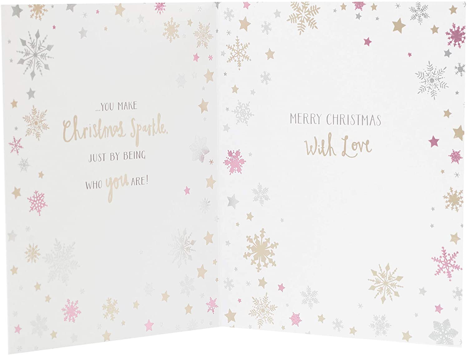 This special daughter Christmas card is full of festive sparkle – finished with silver foiling. Bold lettering and a sweet verse make this the perfect Christmas card for her. Message inside reads: You make Christmas sparkle, just by being who you are! Merry Christmas with love. Envelope included. Card size: 159mm x 184mm.
