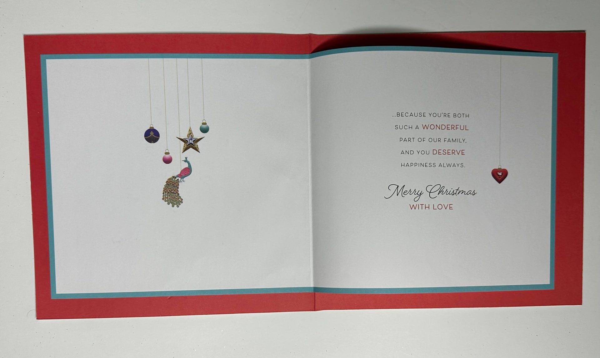 You are viewing: A greeting card Occasion: Christmas Message: ...because you're both such a WONDERFUL part of our family, and you DESERVE happiness always. Merry Christmas WITH LOVE Details: A gorgeous quality embellished foil finished card from the popular card publisher Carlton Cards, it comes complete with an envelope. Size: Square 18cm x 18cm 7" x 7"