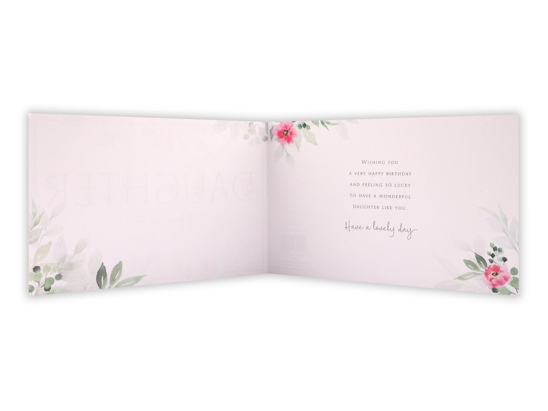 COVER MESSAGE: Daughter With Love on Your Birthday. INSIDE MESSAGE: Wishing you a very happy birthday and feeling so lucky to have a wonderful daughter like you. Have a Lovely Day. SIZE: Envelope size: 143mm x 216mm. PACKAGE SIZE: Standard Letter