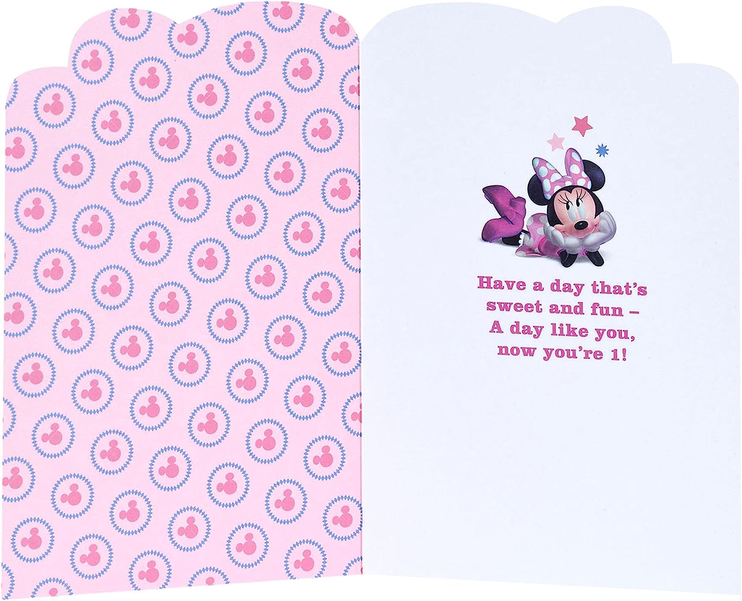 What fun! Someone’s turning one! Send birthday wishes with this Disney card featuring Minnie Mouse. Specially shaped and finished with pink foil. Message Inside Reads: Have a day that's sweet and fun… A day like you, now you're 1! Card Size: 149mm x 229mm. Envelope Included.