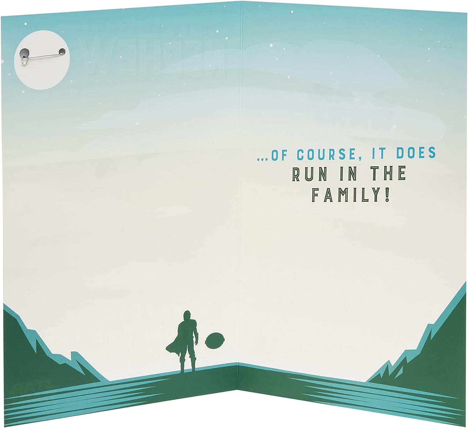 Let your nephew know that the Force is strong in your family with this fun Mandalorian birthday card, complete with a badge featuring characters from the hit Star Wars TV series. Message Inside: ...of course, it does run in the family! Card Size: 149mm x 229mm. Envelope Included.