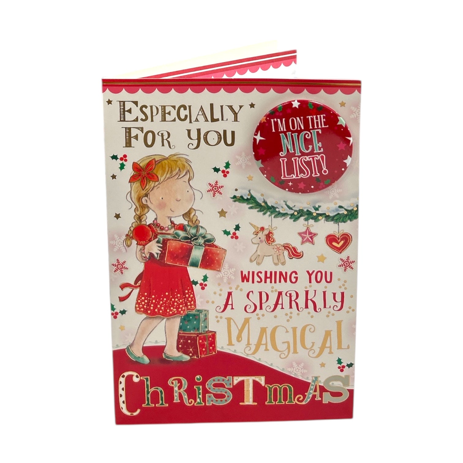 This delightful Christmas card is a sparkling way to send festive wishes “Especially for You.” The design features a cheerful young girl in a red dress holding a wrapped gift, standing beside a stack of presents. Surrounding her are whimsical holiday elements including a unicorn ornament, heart decoration, and a decorated tree branch, all set against a backdrop of snowflakes and stars. A standout feature is the circular badge that reads “I’M ON THE NICE LIST!” in bold white and pink lettering, adding a playful and proud touch. The message “Wishing You a Sparkly Magical Christmas” captures the joyful spirit of the season. Perfect for catalog presentation or personal gifting, this card blends youthful charm with festive flair. Approximate size: 225 x 155 mm.