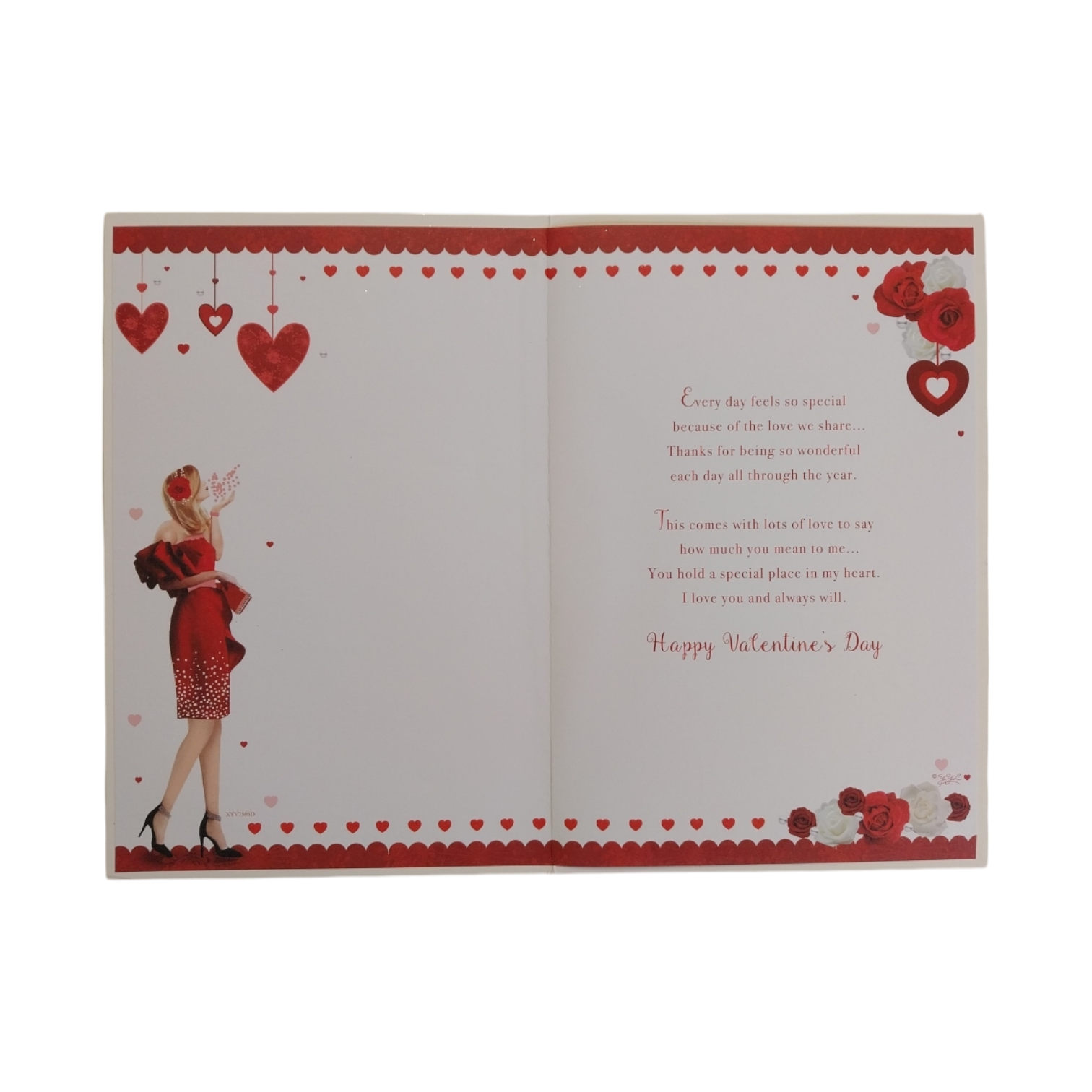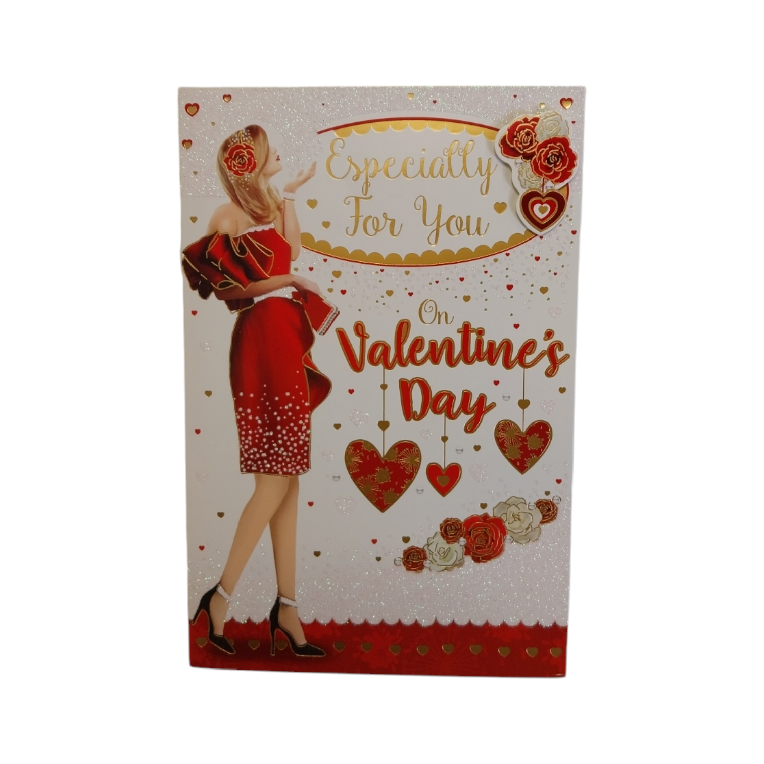 Especially For You Woman In Red Gown Design Valentine's Day Card. Show the one you love just how much you adore them with this stunning Valentine's day card from Xpress Yourself. This luxury valentines card is the perfect keepsake gift for your significant other. Printed on high-quality textured board, this card features gold foil details, silver glitter, embossed elements, and a heartfelt message inside