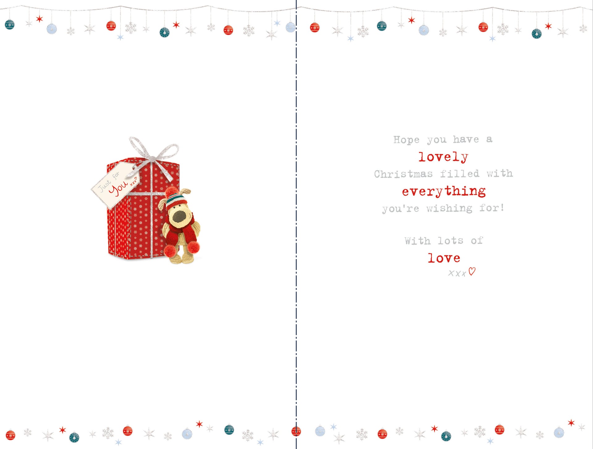 Extra Special Cousin Boofle With Big Present Design Christmas Card. Card size: 184 x 121 mm.