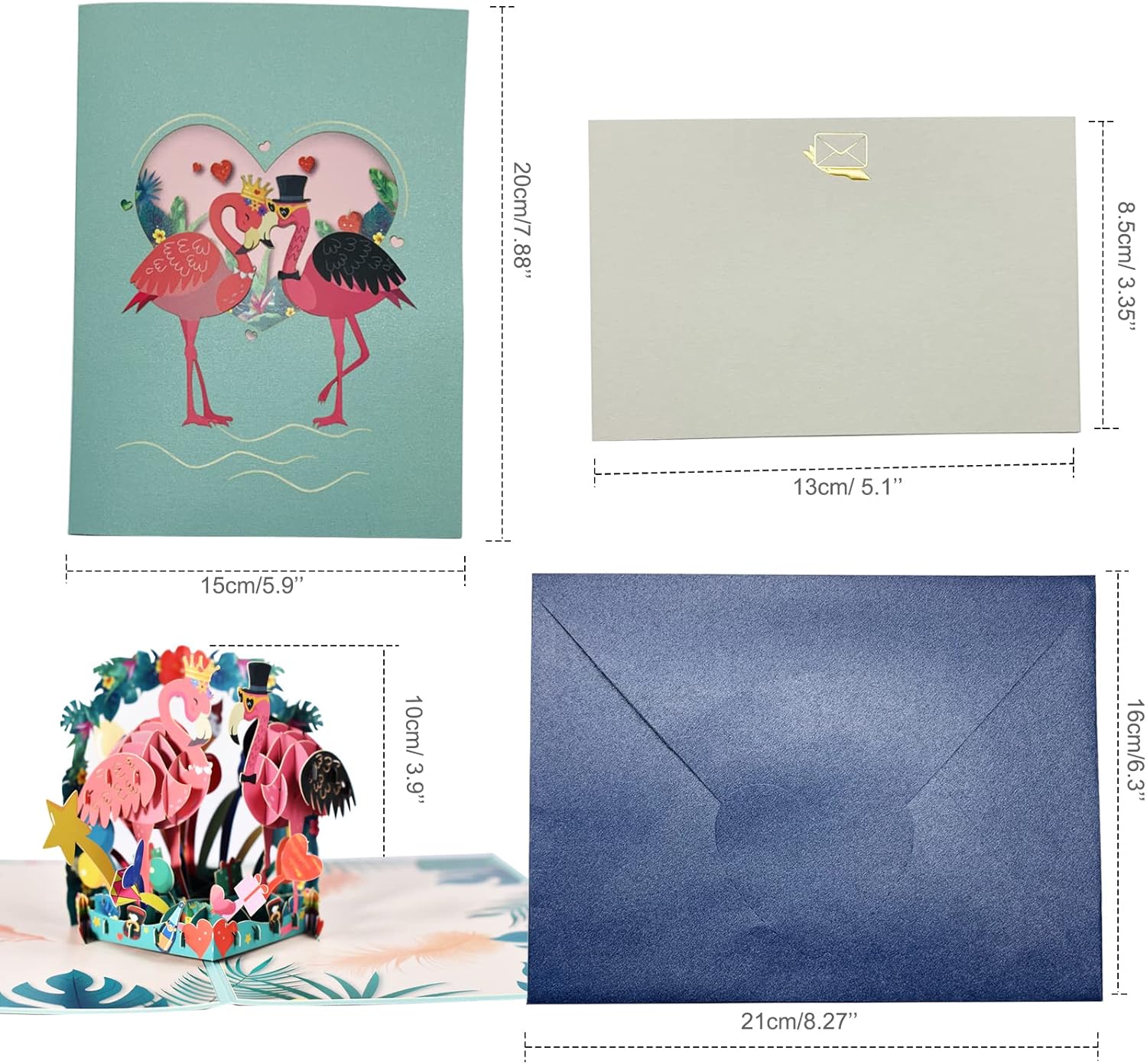 Celebrate love and beauty with this 3D pop-up greeting card featuring a pair of flamingos surrounded by tropical flowers and palm fronds. Flamingos symbolize beauty, balance, hope, love, and happiness, making this card perfect for birthdays, anniversaries, Valentine’s Day, or general messages of affection. The intricate pop-up design creates a stunning, memorable scene for your loved one. Measuring 15 x 20 cm, it includes a small blank insert (8.5 x 13 cm), providing space to write a personalized message.
